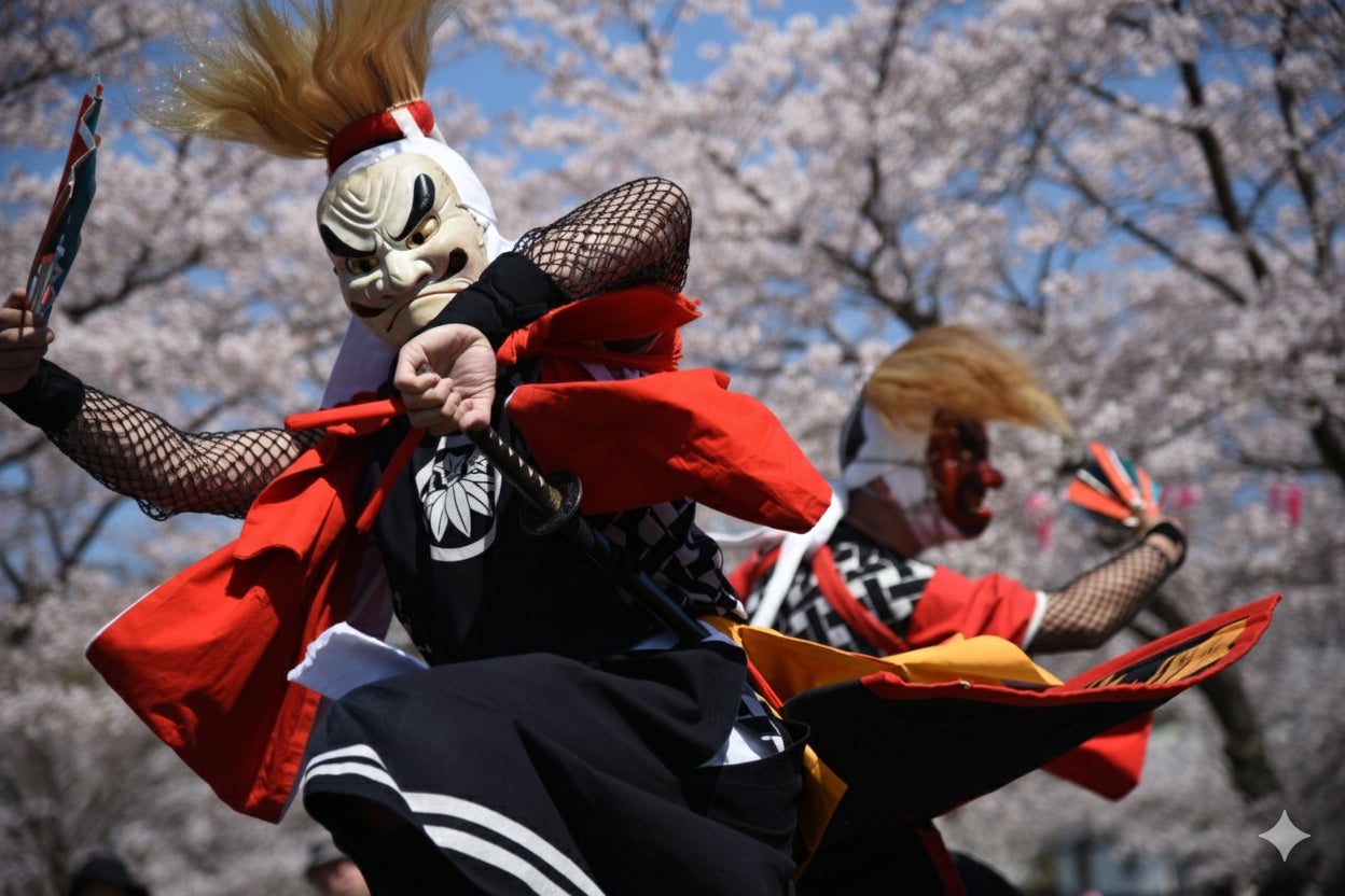 二子鬼剣舞は、日本の東北地方・岩手県を拠点とする民族芸能団体。1200年以上の歴史があり、鬼剣舞は仏道芸能で、元々は念仏剣舞と言われていた。鬼剣舞という名称は「鬼が剣を持って舞う」を意味し、演者が着用する鬼のような面に由来している。これらの面は仏教の神々を象徴するもので、演目には剣舞のほか、扇や素手を用いた演舞、アクロバティックな動きが含まれ、ソロや群舞、そして踊らず整列して念仏を唱えることもある。