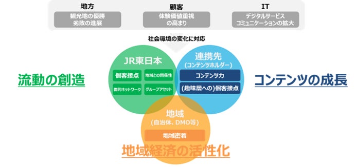 JR東日本では、これまで培ってきた地域の皆さまとの関係性や東日本全域に広がる面的ネットワーク等のグループの強みを活かし、多様化する趣味嗜好からつながる“コンテンツ軸”により流動を創造していきます。