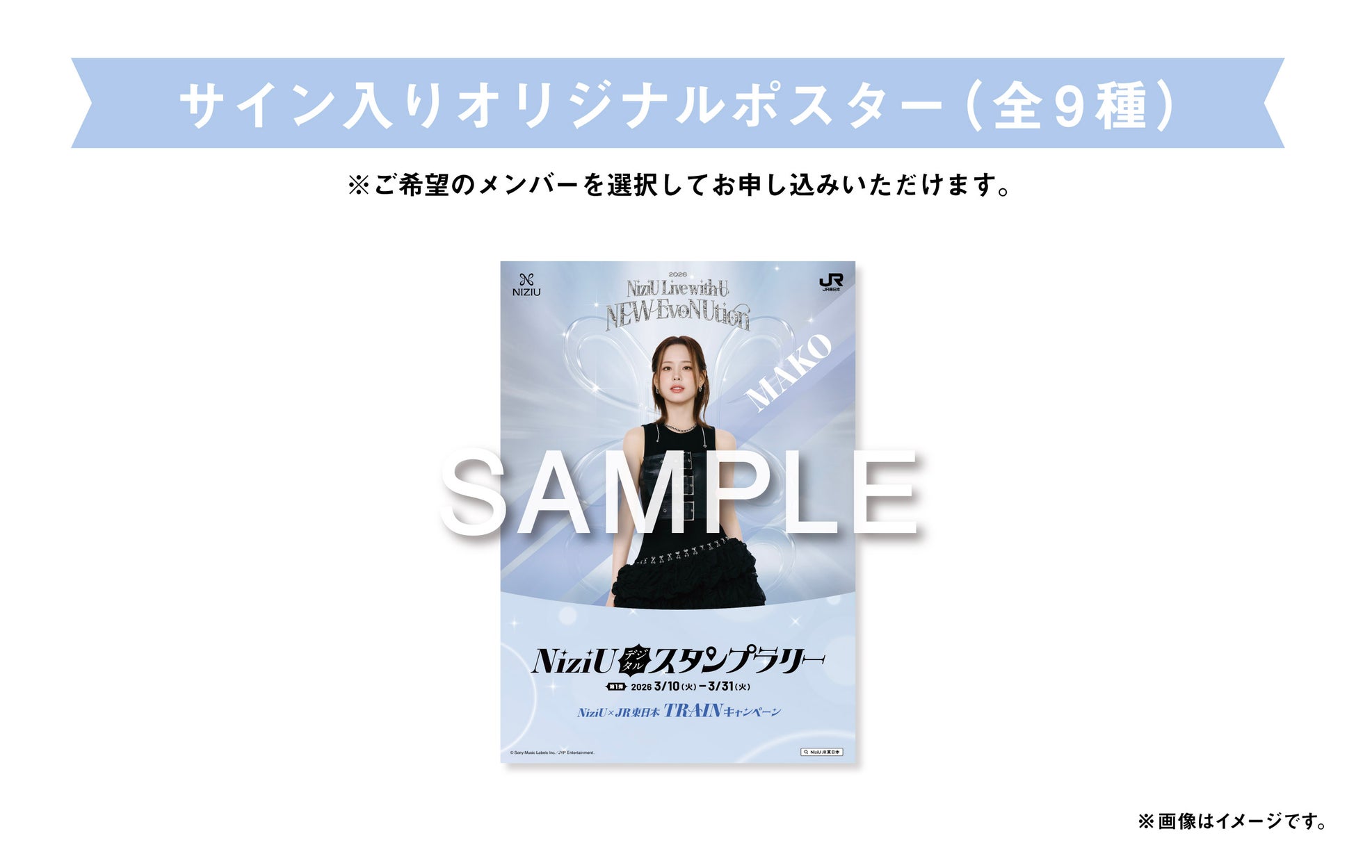 【東京9駅コンプリート賞】 東京エリア9駅をコンプリートした方から抽選で45名様に、NiziUメンバーサイン入りオリジナルポスター(全9種)をプレゼント 【新幹線賞】 東京エリア9駅+東北・山形・秋田・上越・北陸新幹線の中からいずれか1駅の合計10駅達成した方から抽選で45名様に、NiziUメンバーサイン入りフォトカードセット(4枚入り・全9種)をプレゼント |