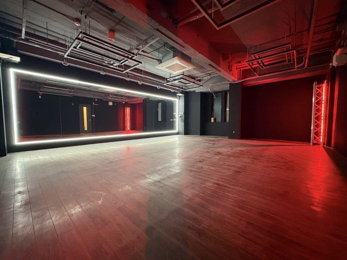ステンレスシート×梁LED×投光機が生み出す、圧倒的なスケールと存在感。8.1mのワイドミラーでフォーメーションも美しく、大人数の練習・撮影に最適!10〜25人の利用におすすめ!