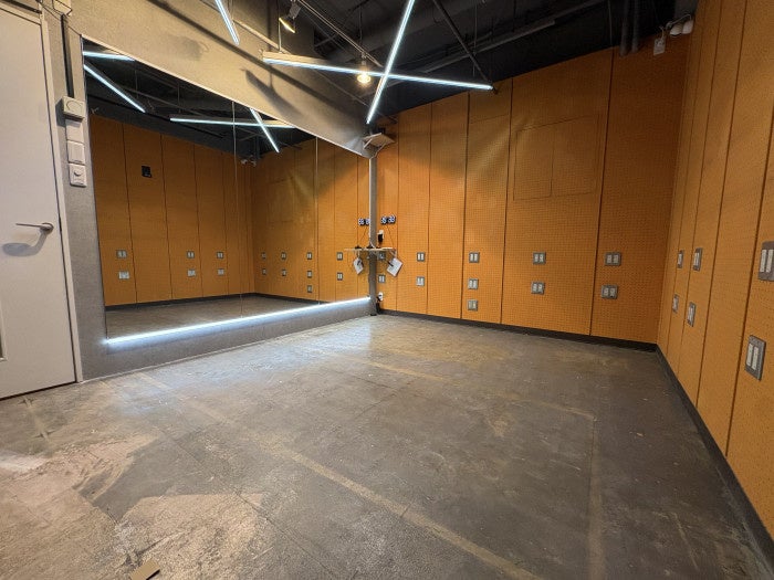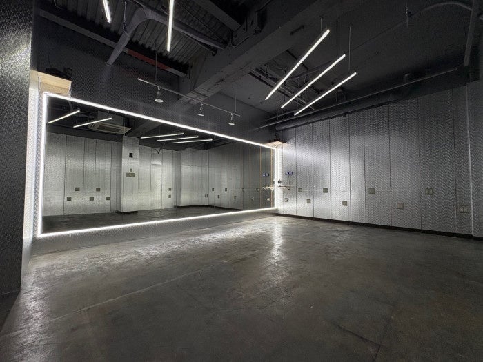 ステンレスシート×梁LED×投光機が生み出す、圧倒的なスケールと存在感。8.1mのワイドミラーでフォーメーションも美しく、大人数の練習・撮影に最適!10〜25人の利用におすすめ!