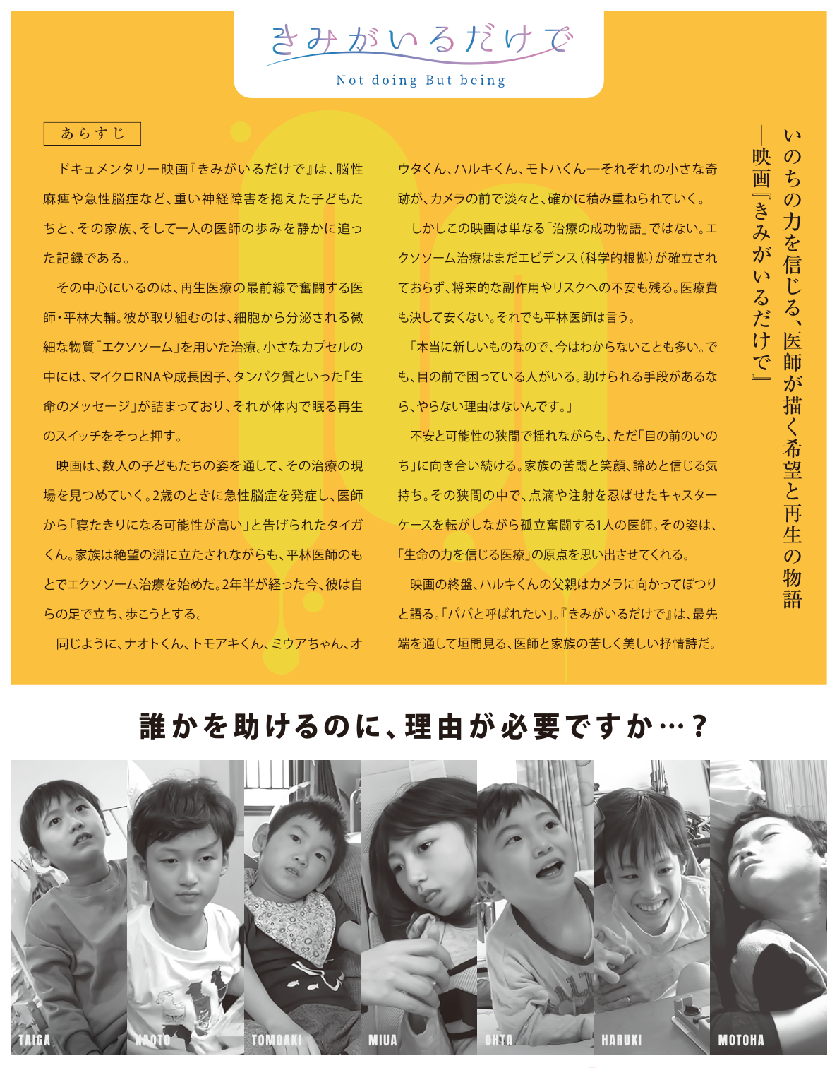 近年、大学病院や総合病院での臨床研究が相次ぎ、急速に社会実装が進むエクソソーム。その黎明期から一貫して臨床の最前線に立ち、登録患者数1,700名、延べ診察数3,500件(直近1年で1,800件超)の臨床実績を積み上げてきた一人の医師。ようやく社会的にこの領域の可能性に注目が集まり始めた今、彼が向き合ってきた現場の日常は、なぜ「映画」という形を成したのか。その真意を問うドキュメンタリー作品『きみがいるだけで』が、2026年3月4日よりAmazon Prime Video、U-NEXT、Hulu他、主要プラットフォームにて一斉配信開始されます。