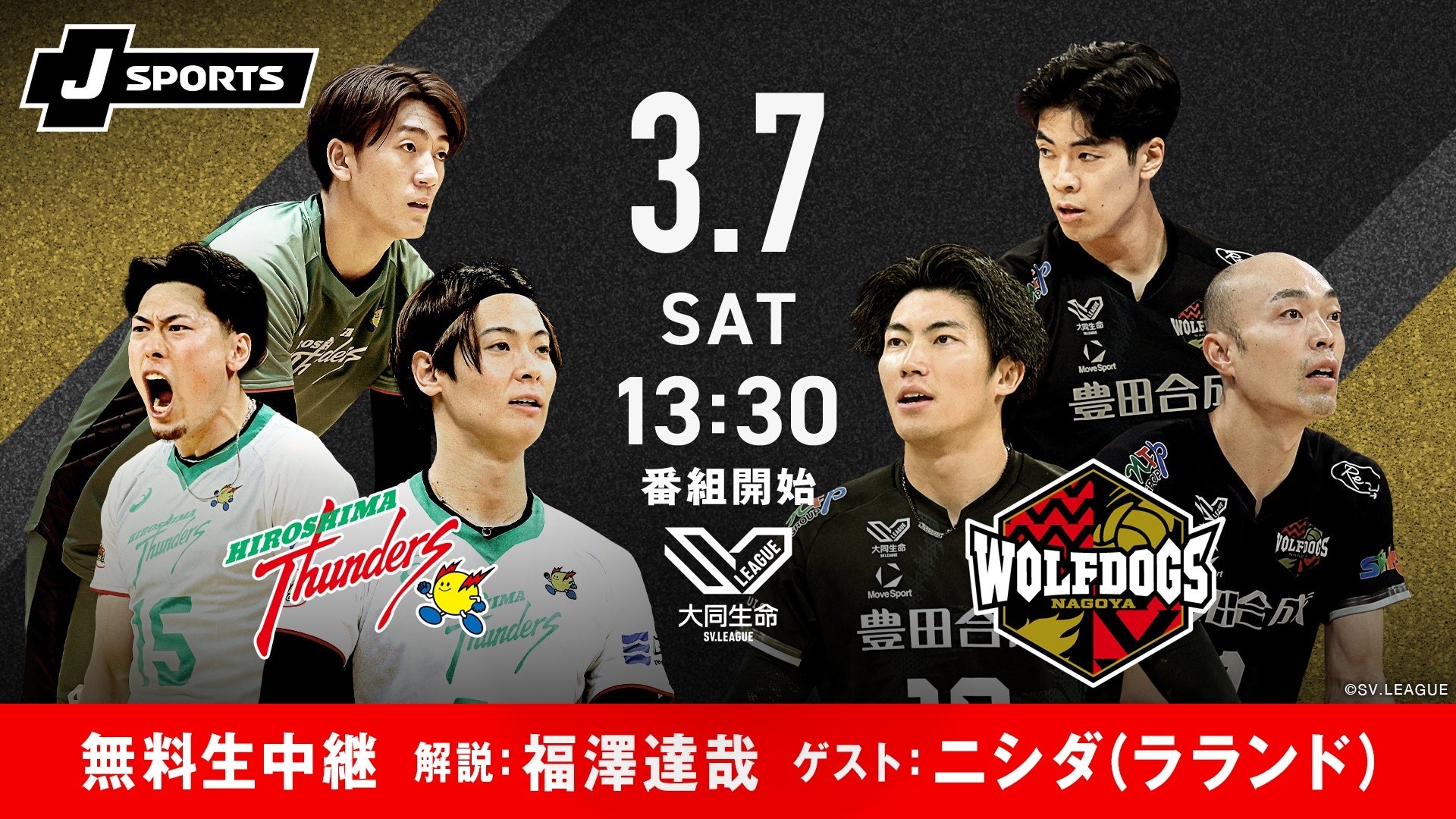 新しい未来のテレビ「ABEMA(アベマ)」は、J SPORTSのコンテンツを視聴できる「ABEMA de J SPORTS」にて、2026年3月7日(土)開催の「2025-26 大同生命SV.LEAGUE MEN」の第16節となる広島サンダーズ対ウルフドッグス名古屋の試合を生中継することをお知らせいたします。本試合の解説には、バレーボール元日本代表の福澤達哉氏、ゲストには元バレー部でお笑いコンビ・ラランドのニシダの出演が決定いたしました。