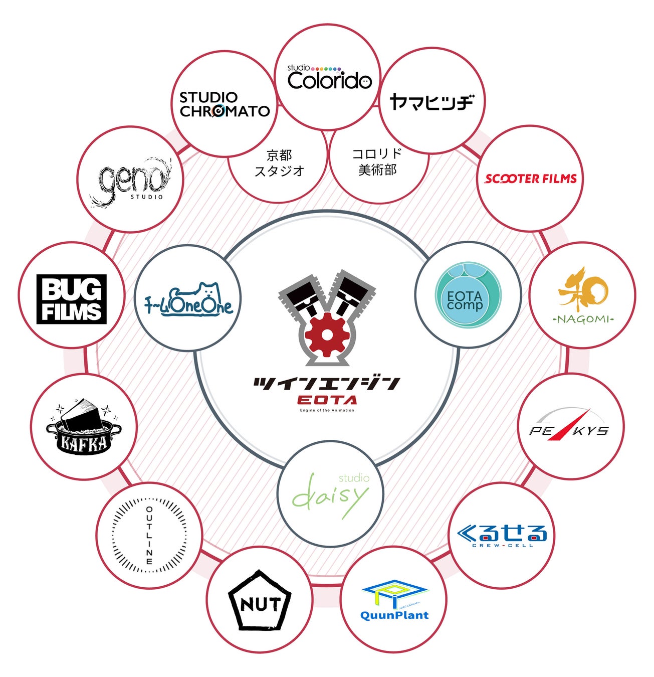 グループ所属スタジオ:スタジオコロリド、ジェノスタジオ、スタジオカフカ、BUG FILMS など計18スタジオ