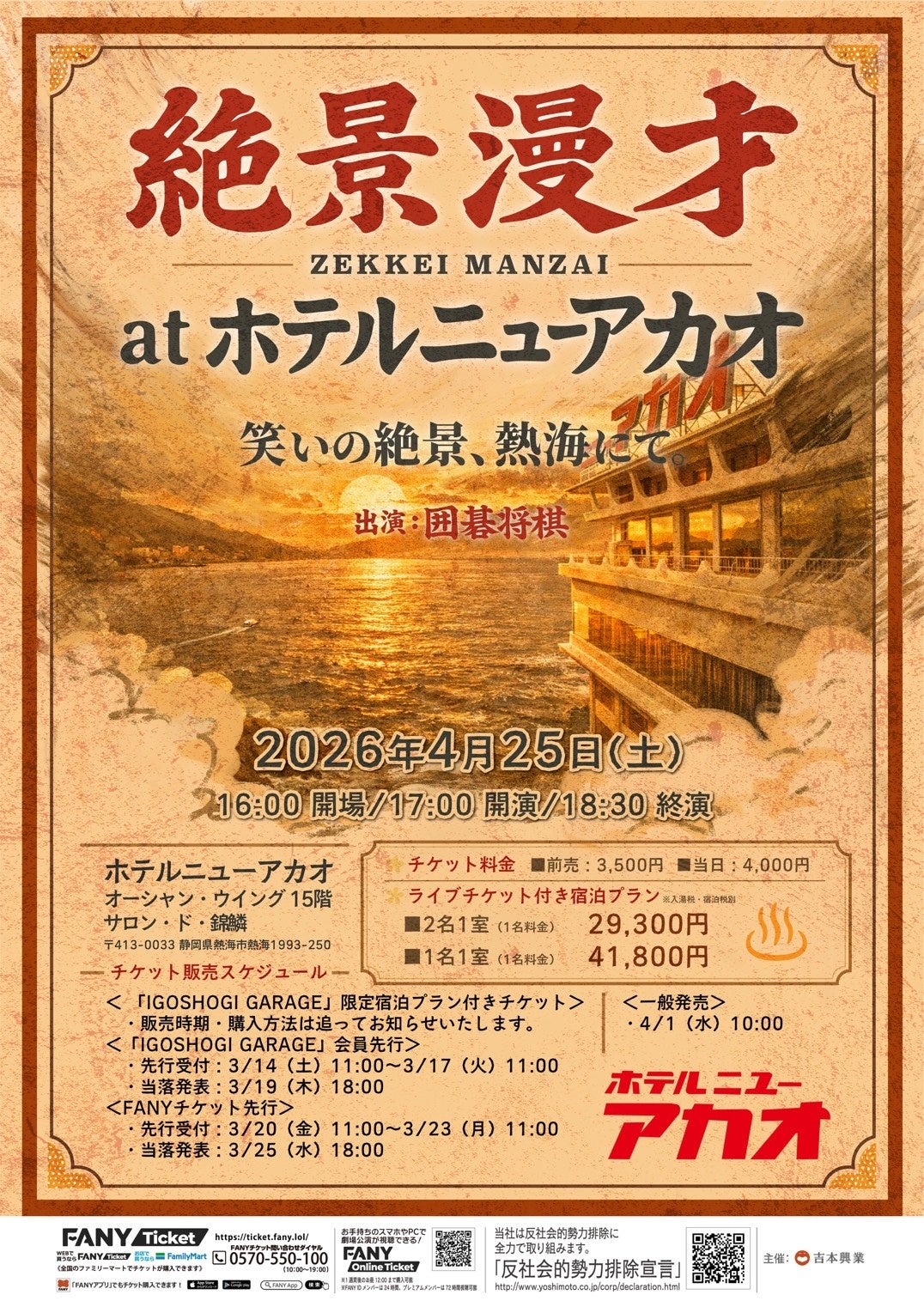 囲碁将棋が全国の絶景を舞台に漫才を披露する人気ライブシリーズ『ZEKKEI MANZAI』を、4月25日(土)に静岡県熱海市の「ホテルニューアカオ」内「サロン・ド・錦鱗」にて開催することが決定しました。