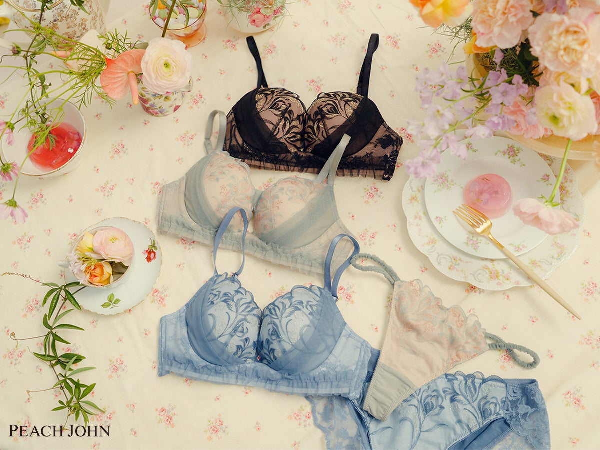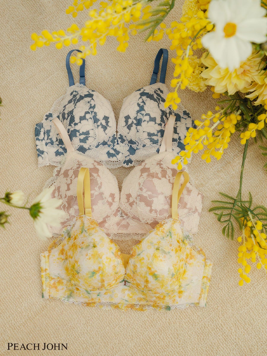 透け感のある編み柄と光沢感のあるサテン調素材のコントラストが印象的な、ストレッチラッセルレースを贅沢に使用した「ナイスバディブラ」シリーズ。新色“ミモザ”はホワイトをベースに、イエローの濃淡とグリーンで水彩画調の花柄をプリント。“サクラ“はライトピンクをベースに、中心を濃いピンクの桜の花をプリントしました。