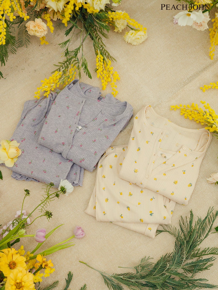 カラーは2色展開。ミモザとバラの小花をプリントし、明るくやさしい印象のイエロー。グレーはヘザーグレー地にチューリップの小花をあしらい、甘さを抑えた大人フェミニンな雰囲気に仕上げました。