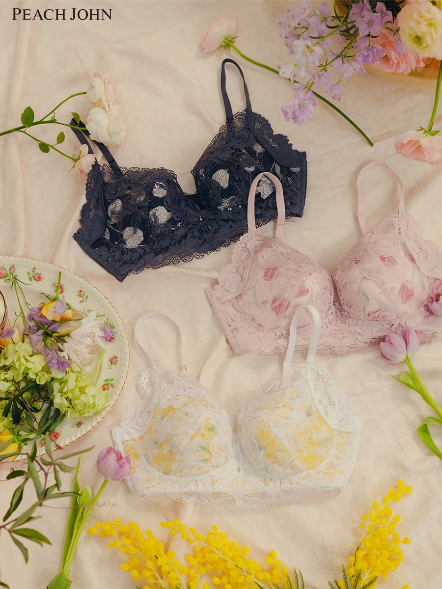透け感のある編み柄と光沢感のあるサテン調素材のコントラストが印象的な、ストレッチラッセルレースを贅沢に使用した「ナイスバディブラ」シリーズ。新色“ミモザ”はホワイトをベースに、イエローの濃淡とグリーンで水彩画調の花柄をプリント。“サクラ“はライトピンクをベースに、中心を濃いピンクの桜の花をプリントしました。