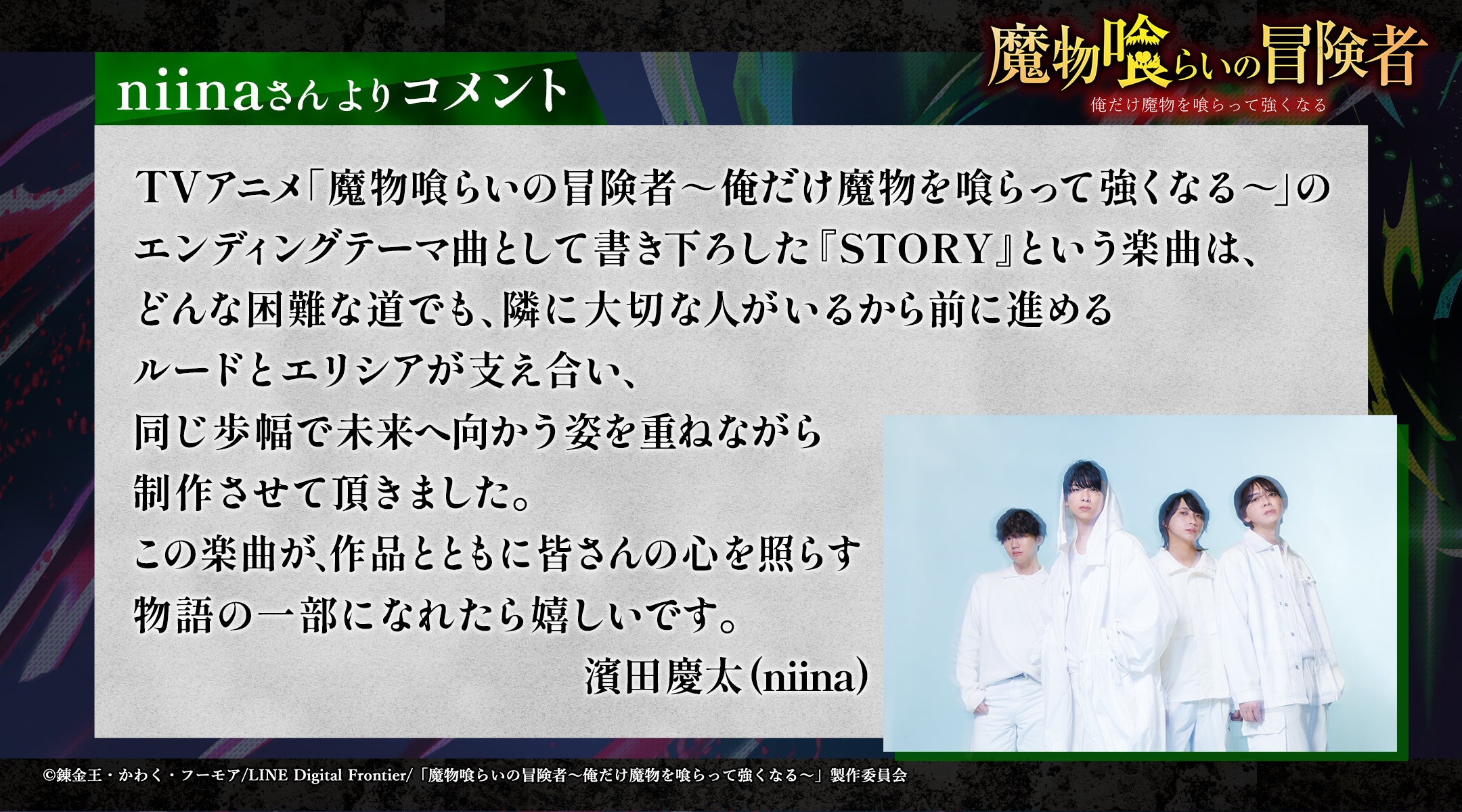 株式会社イマジカインフォス(本社:東京都 代表取締役社⻑:前⽥起也、以下イマジカインフォス)は、⼤⽇本印刷株式会社(本社:東京都 代表取締役社長:北島義⻫、以下、DNP)との共同事業「AnimationID」の第6弾作品、『魔物喰らいの冒険者~俺だけ魔物を喰らって強くなる~』(「LINEマンガ」連載)の放送情報およびED情報を公開いたします。
