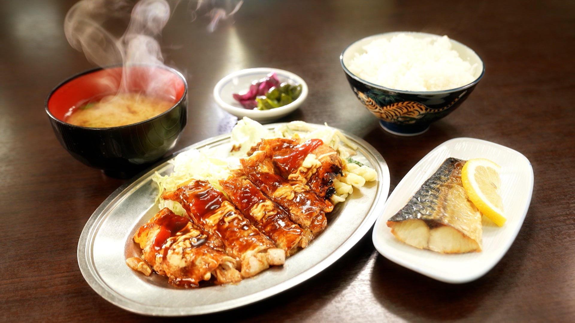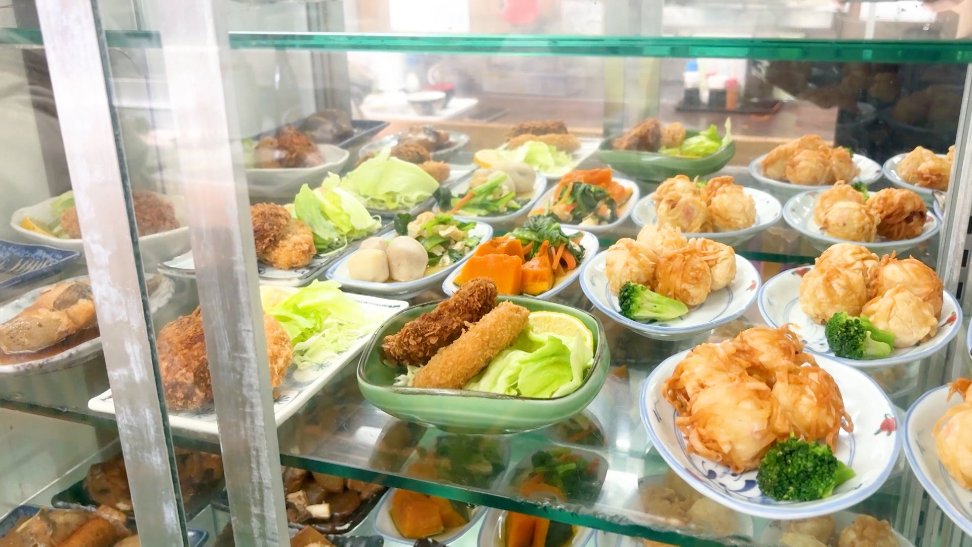 中央のテーブルには丁寧に盛りつけられた小鉢が並びます。カレー肉じゃが、揚げだし豆腐、肉団子の黒酢あんかけなど、幅広い顔ぶれがそろい、味わいもどこかやさしくて上品。懐かしさが込み上げる、王道の大衆食堂です。