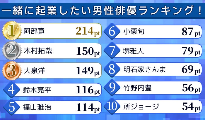 今回は、目標達成に向けた強い精神力や行動力が求められる『起業』において「この人となら一緒に起業してみたい」と思われている男性俳優を調査。