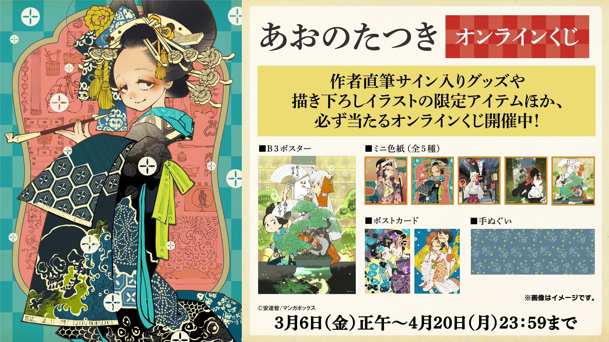 株式会社マンガボックス(本社:東京都港区、代表取締役:安江 亮太、以下マンガボックス社)は、現在連載中の江戸ファンタジーコミック『あおのたつき』(作者:安達智)の限定グッズが当たるオンラインくじ(発売:TCエンタテインメント株式会社)が2026年3月6日(金)12:00より販売開始されることをお知らせします。