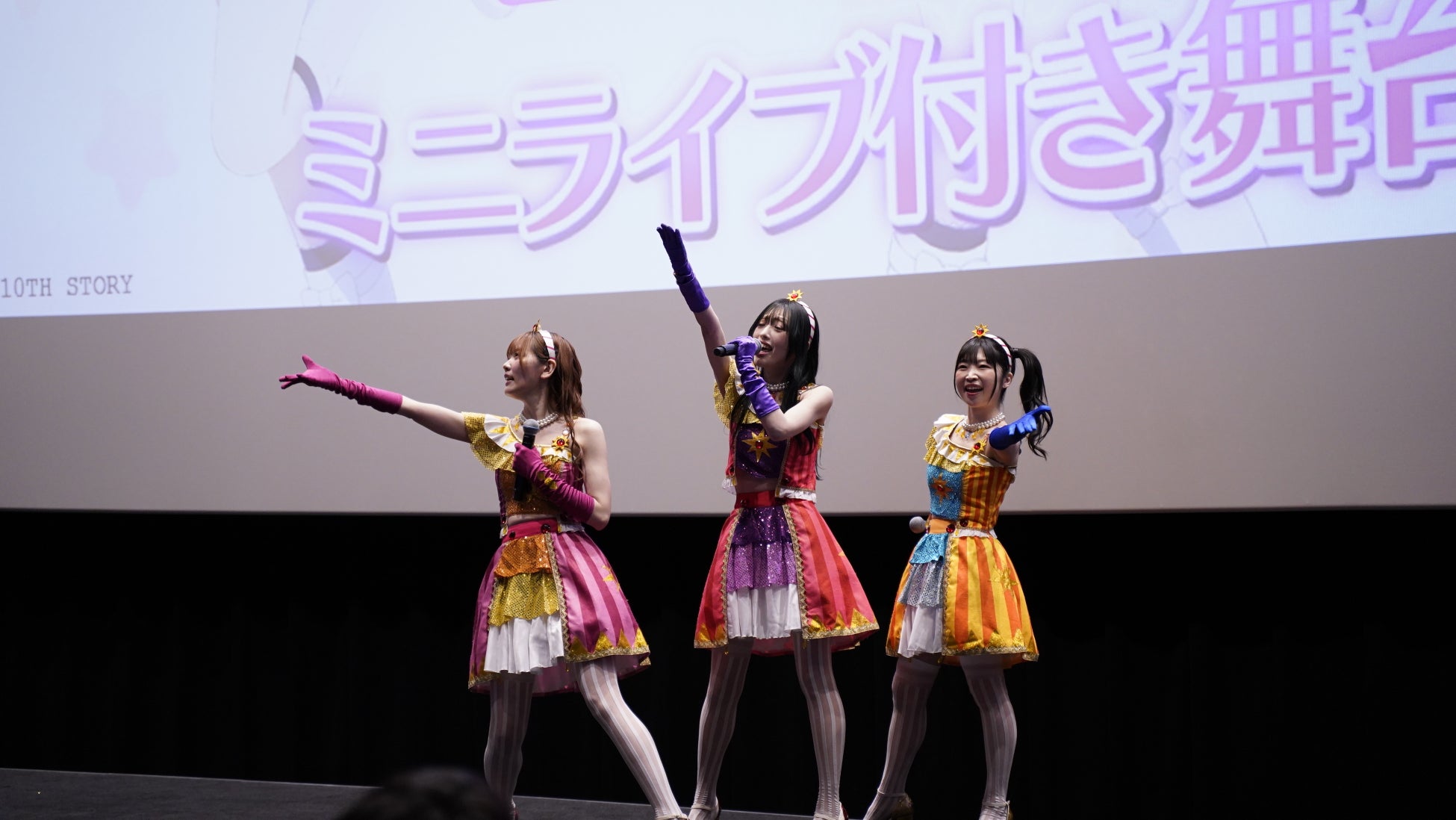 わか(星宮いちご歌唱担当)、ふうり(霧矢あおい歌唱担当)、ゆな(紫吹 蘭歌唱担当)の3人が登壇し、本編を観終えたファンへ向けてミニライブをお届けしました。