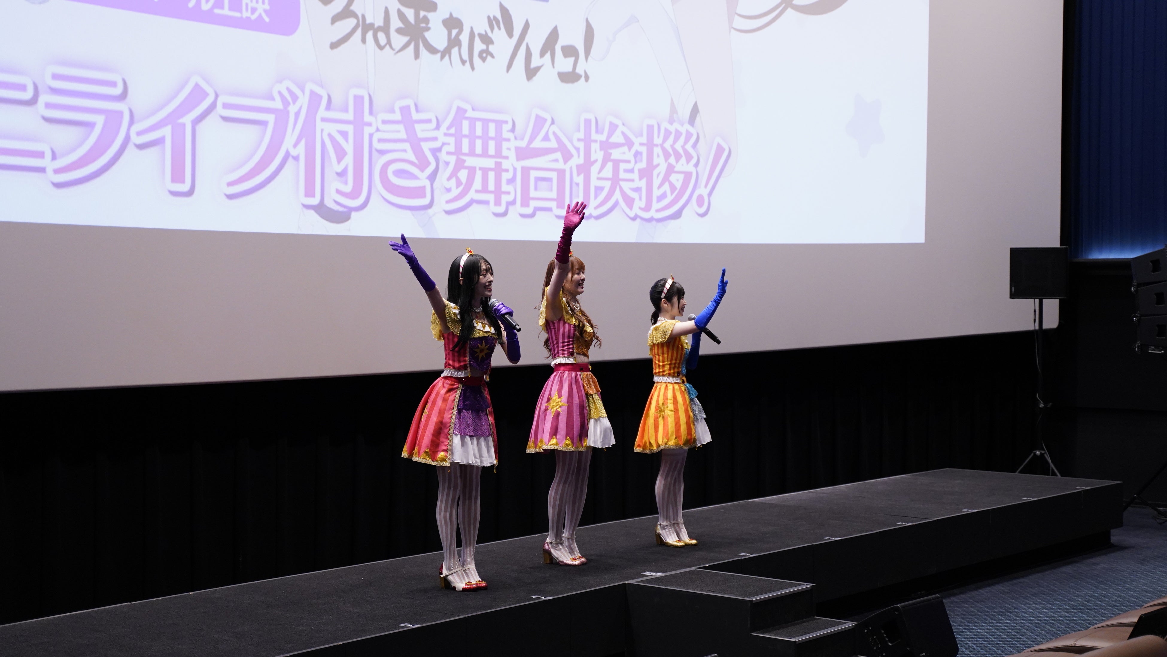 わか(星宮いちご歌唱担当)、ふうり(霧矢あおい歌唱担当)、ゆな(紫吹 蘭歌唱担当)の3人が登壇し、本編を観終えたファンへ向けてミニライブをお届けしました。