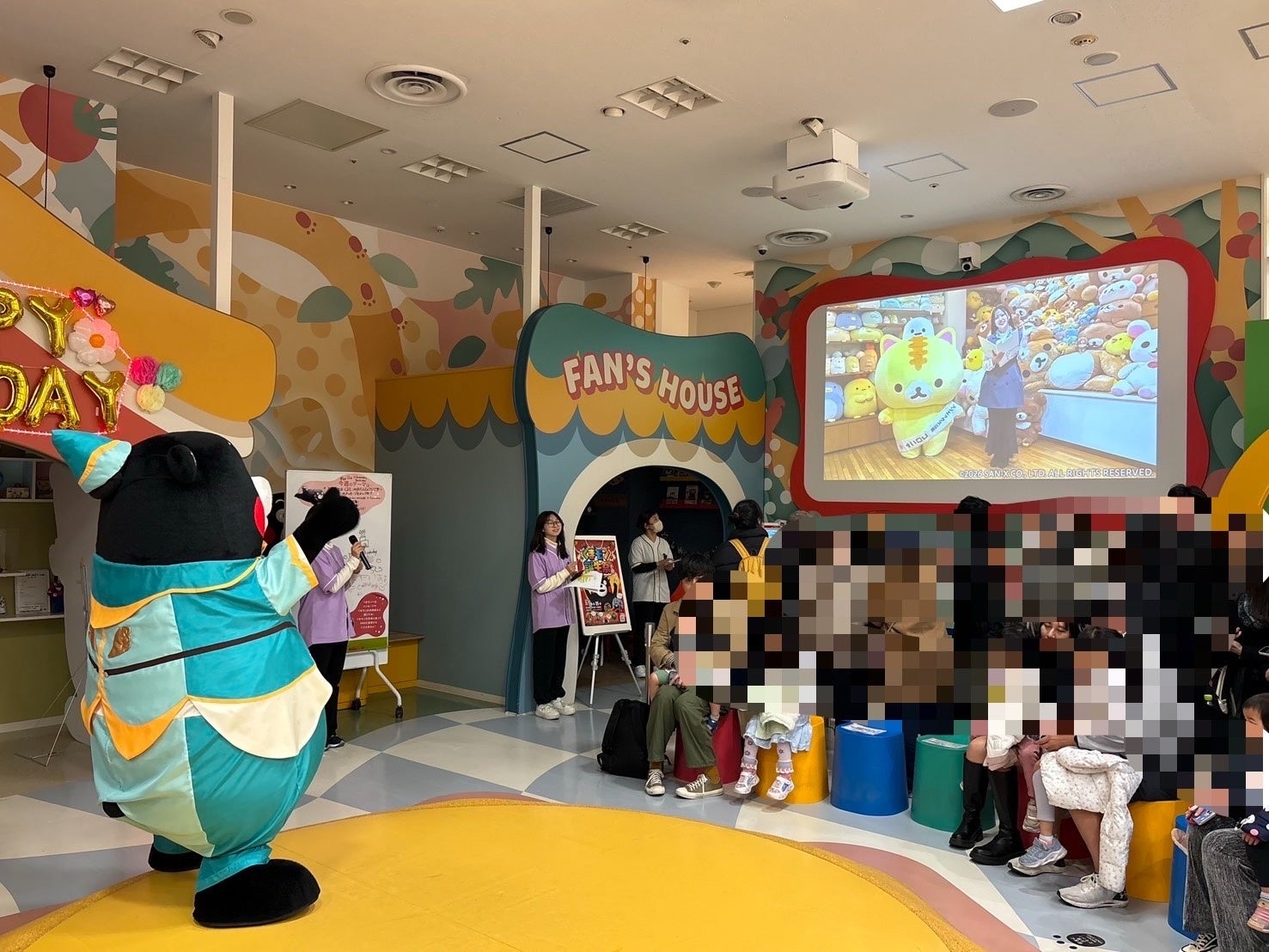 ここでサプライズ。『リラックマ』や『すみっコぐらし』を⽣み出した有名なキャラクター会社サンエックスのキャラクターであり広報も務める『コロニャ』からのビデオメッセージが館内に流れる。お誕⽣⽇のお祝いと共に、「昨年、くまモンから相談を受けて、くまモンのぬいぐるみ発売させていただきましたが、⼤変好評とのことで、本⽇ぬいぐるみの第2 弾が発売となった」と伝えられた。