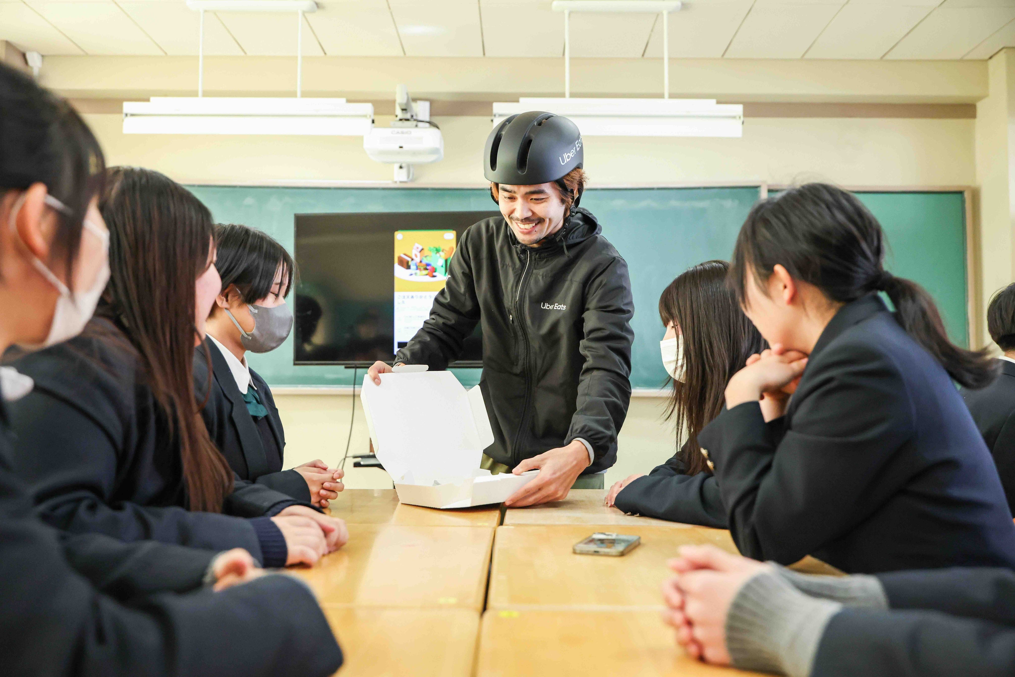 本プロジェクトの趣旨に賛同したくまと、移住先・皆野町を中心に活動するいよ氏の2人が、卒業生へのエールを込めて有志で参加。当日は、2人がUber Eatsの配達パートナーに扮してサプライズ登場し、生徒たちが注文した商品を直接手渡すと、教室内は驚きと大きな歓声に包まれました。