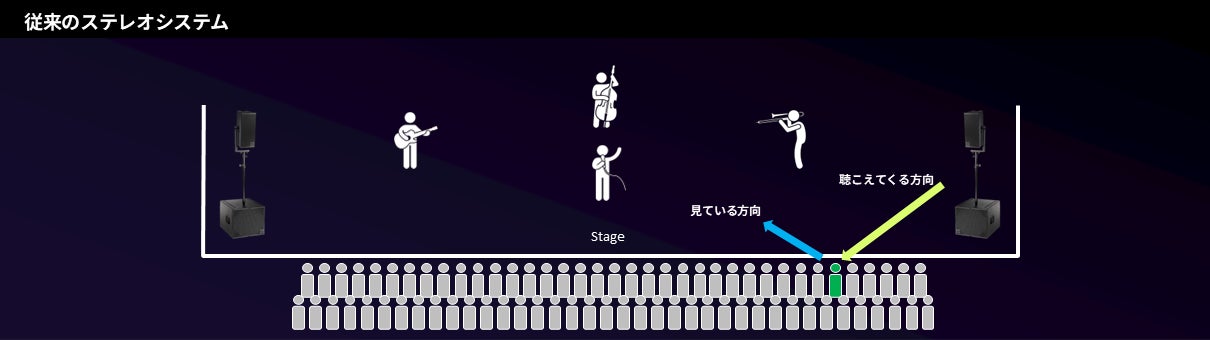左右のスピーカーを主軸とする従来のステレオシステムでは、座席位置によって視覚と聴覚の定位に差異(ズレ)が生じることが一般的でした。d&b Soundscapeは、信号処理エンジン「DS100/DS100M」によって、こうした物理的制約を超え、ステージ上のパフォーマーの位置情報に合わせて、音をリアルタイムに配置します。これにより、従来スイートスポットと呼ばれていた、中央付近の座席に限らず、会場全体にわたって視覚と聴覚が自然に一致したリスニング体験を実現。観客はより深くパフォーマンスに没入することが可能となります。