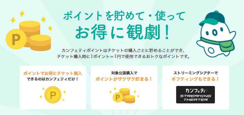 カンフェティポイントは、チケット購入ごとに100円=1ポイントで付与され、次回のチケット購入時に利用できるお得なポイントサービスです。