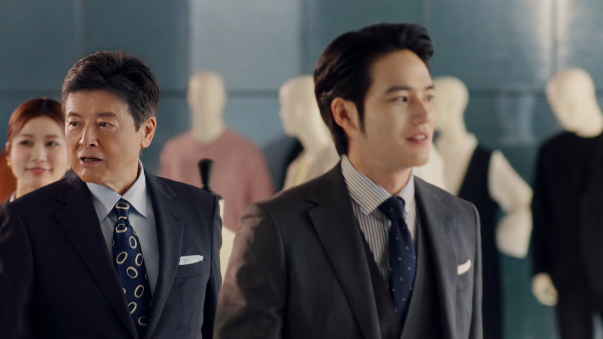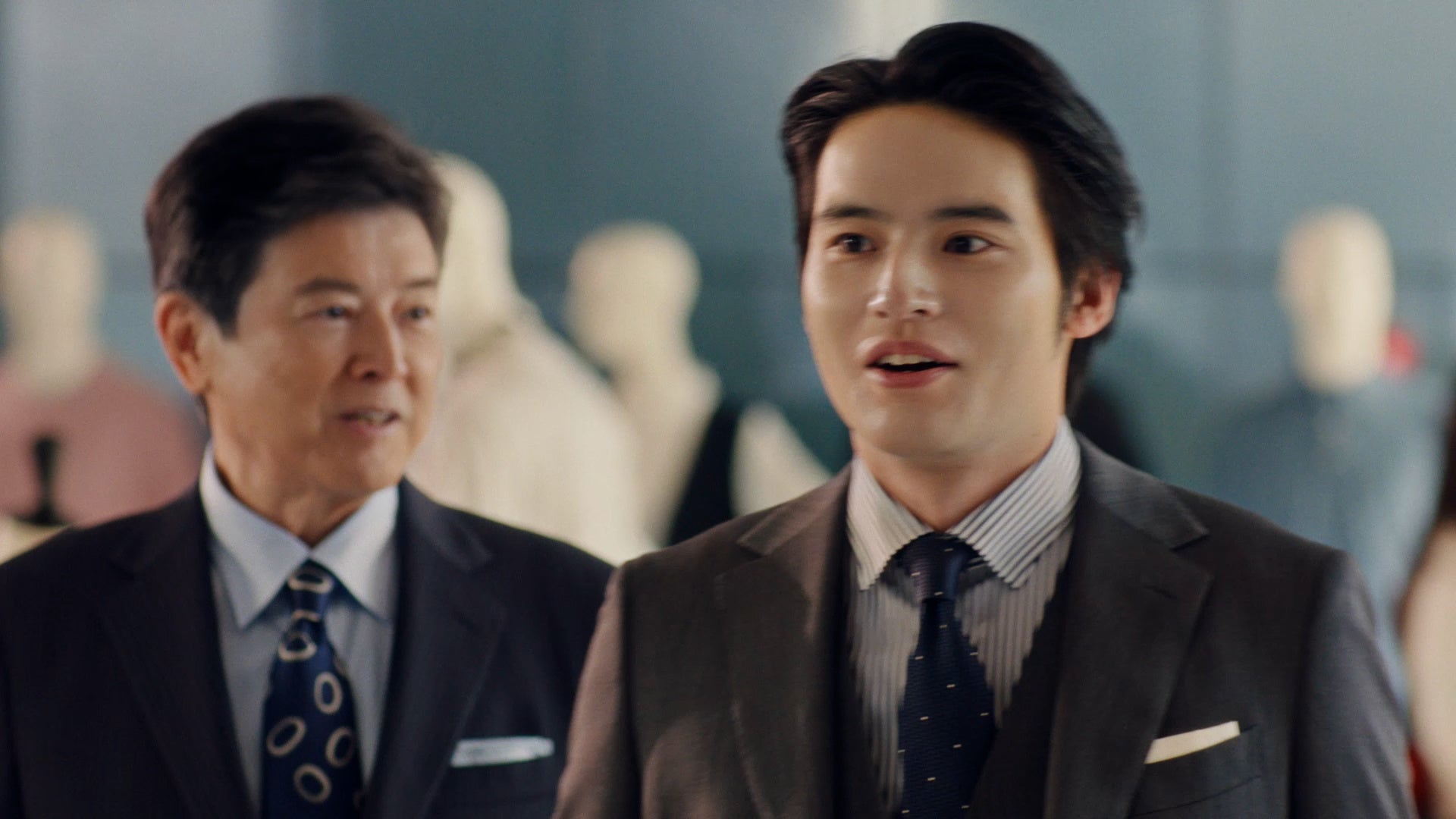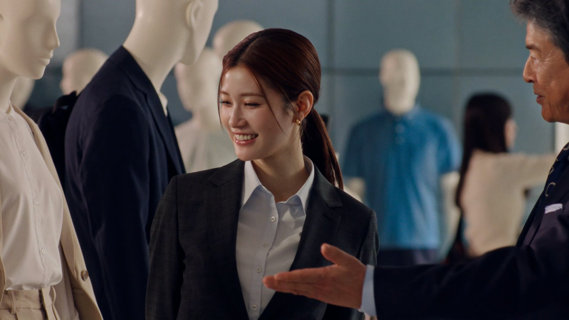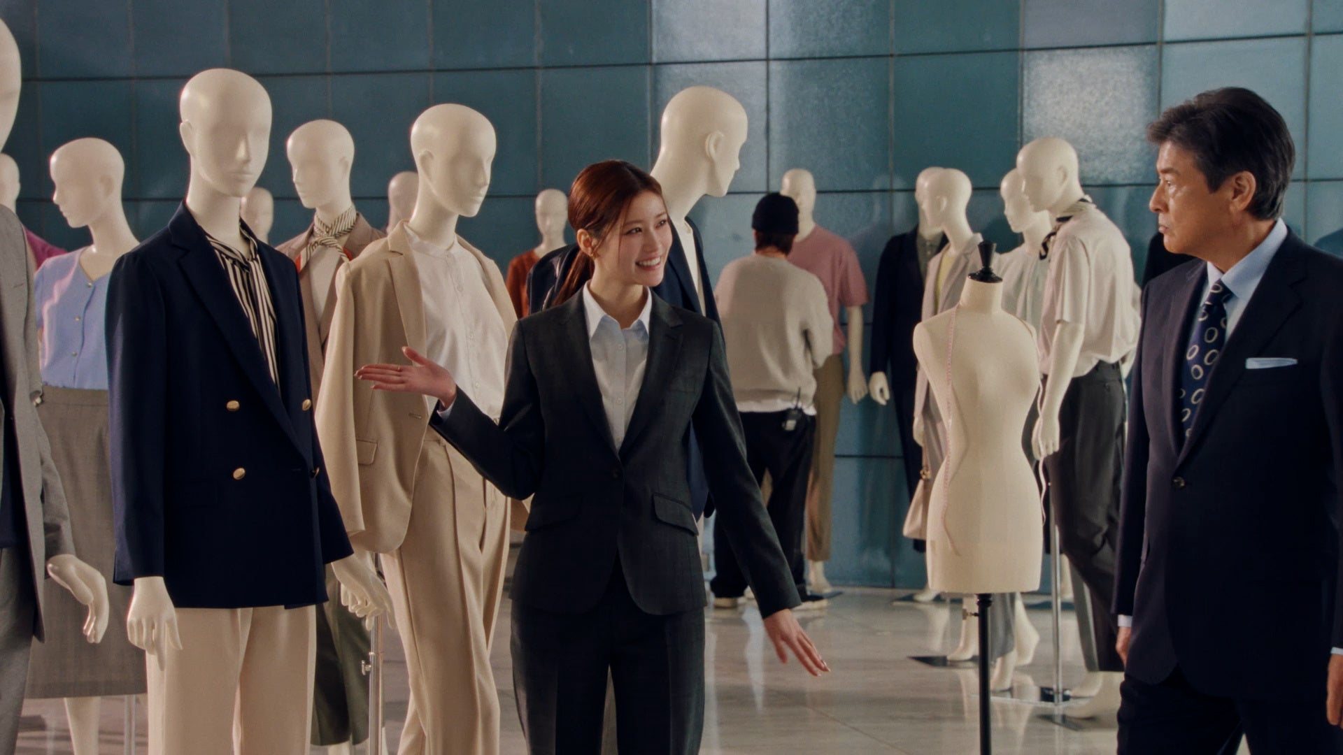 本CMは、スタジオ入りする出演者たちの自然な表情を捉えた「オフショット風」のシーンから始まります。そこには春の最新ビジカジコーデを身にまとった数多くのマネキンが用意されており、その多種多様なバリエーションを前に三浦さん、水上さん、生見さんの演技ではない本物のリアクションに。そして三浦さんの「青山は、スーツだけじゃないよね」という一言に対し、水上さんが「本当にたくさんありますね」と新鮮な驚きを見せ、その自然な会話から温かみを感じます。また、生見さんがダブルの紺ブレを着せ付けているマネキンを見て「これ素敵じゃないですか?」と尋ねると、三浦さんが「似合いそうだね」と優しく太鼓判を。本番シーンでは、その言葉通りダブルの紺ブレを完璧に着こなす生見さんの姿が印象的です。