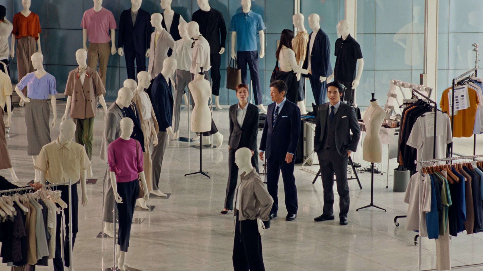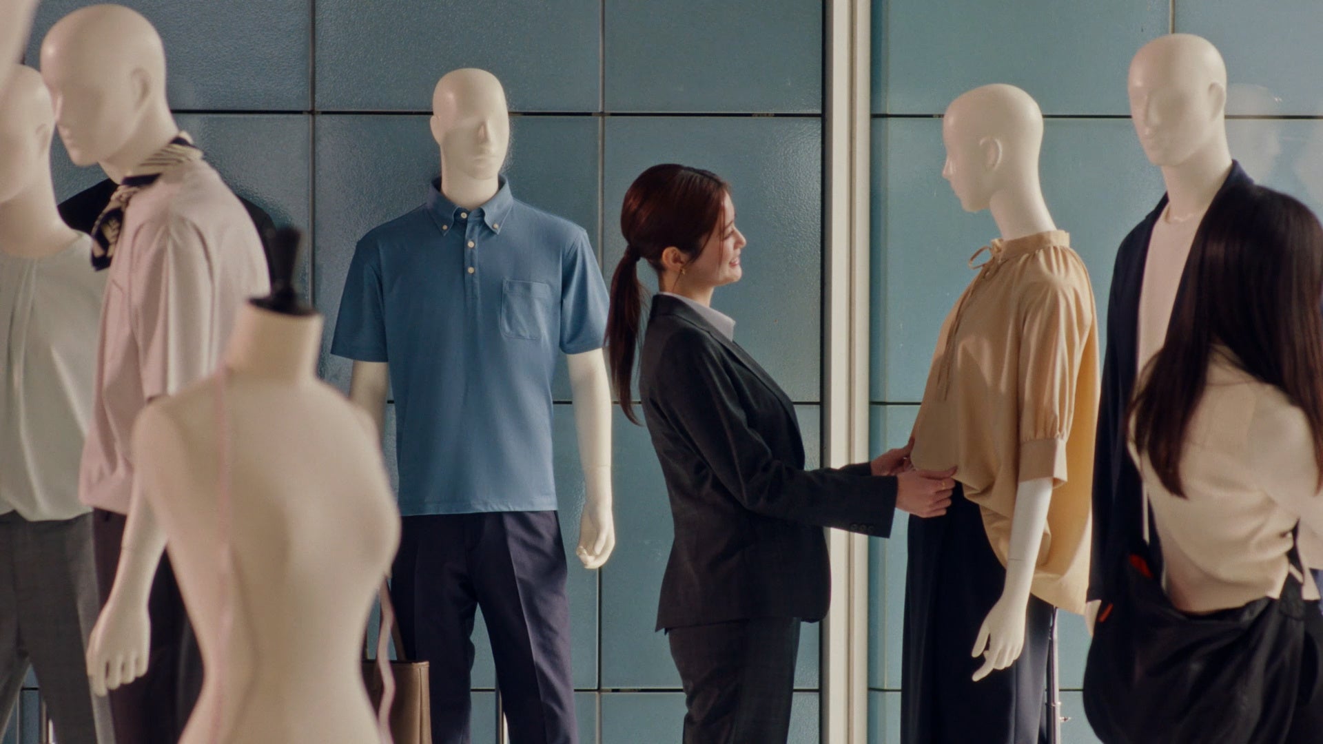 今回は、『洋服の青山』がスーツだけでなく、あらゆるビジネスシーンに対応したアイテムを取りそろえていることを視覚的に訴求するCMとなっています。スタジオに設置している数多くのマネキンに春の最新ビジカジコーデを着せ付け。さらには三浦さん、水上さん、生見さんがそれぞれ春の新作を身にまとい、ビジカジが持つ「自由さ」と「品格」を表現しました。
