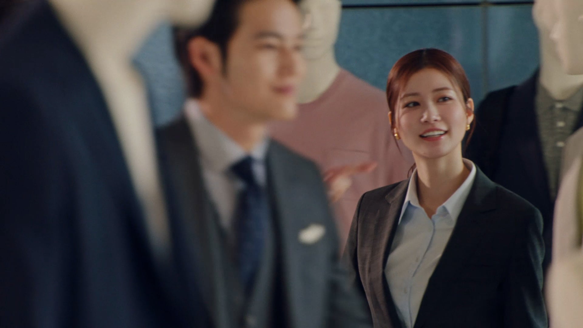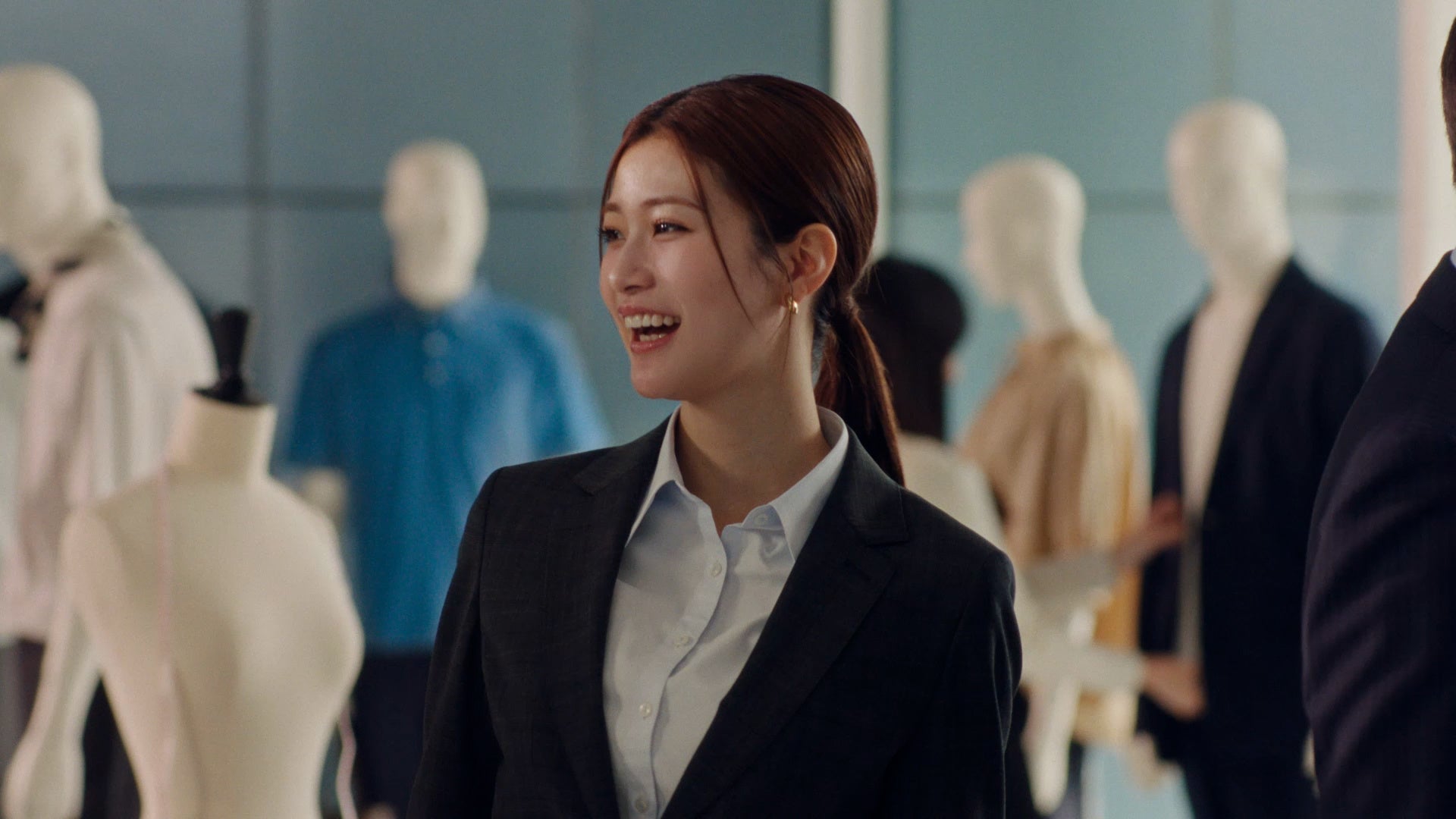 本CMは、スタジオ入りする出演者たちの自然な表情を捉えた「オフショット風」のシーンから始まります。そこには春の最新ビジカジコーデを身にまとった数多くのマネキンが用意されており、その多種多様なバリエーションを前に三浦さん、水上さん、生見さんの演技ではない本物のリアクションに。そして三浦さんの「青山は、スーツだけじゃないよね」という一言に対し、水上さんが「本当にたくさんありますね」と新鮮な驚きを見せ、その自然な会話から温かみを感じます。また、生見さんがダブルの紺ブレを着せ付けているマネキンを見て「これ素敵じゃないですか?」と尋ねると、三浦さんが「似合いそうだね」と優しく太鼓判を。本番シーンでは、その言葉通りダブルの紺ブレを完璧に着こなす生見さんの姿が印象的です。