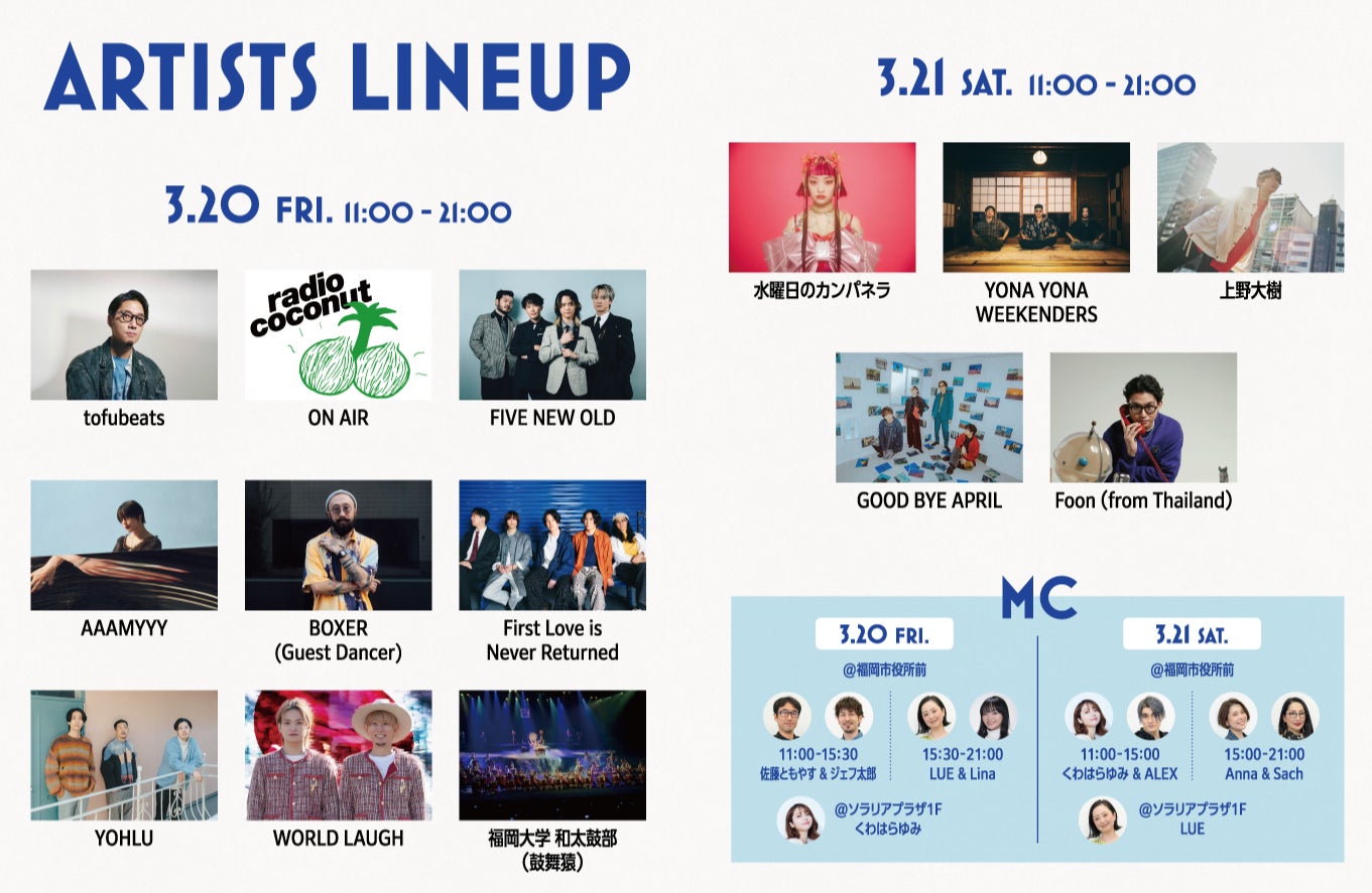 3月20日(金・祝)〜21日(土)の2日間、福岡市役所前西側ふれあい広場、ソラリアプラザ1Fゼファの2会場にて開催!LOVE FMならではのグローバルで楽しいフェスが、天神の街に帰ってきます。