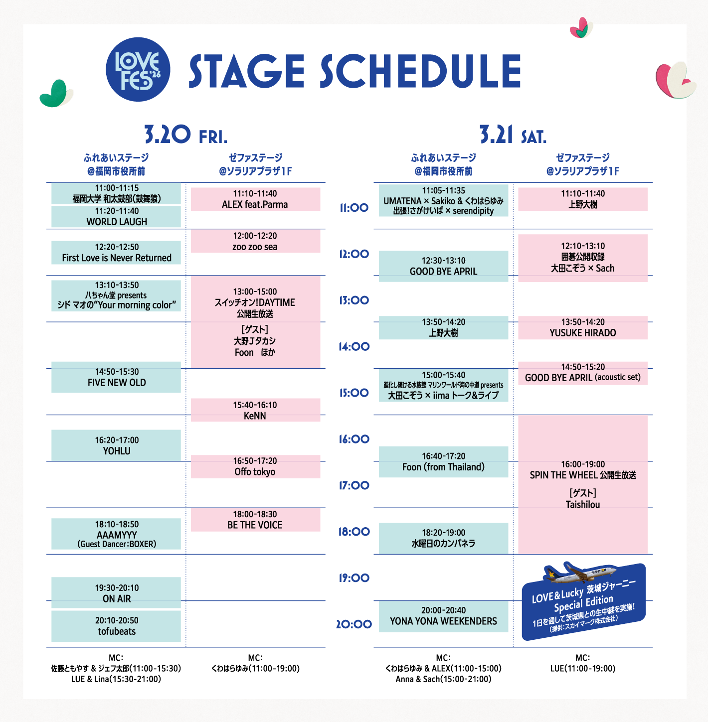 3月20日(金・祝)〜21日(土)の2日間、福岡市役所前西側ふれあい広場、ソラリアプラザ1Fゼファの2会場にて開催!LOVE FMならではのグローバルで楽しいフェスが、天神の街に帰ってきます。