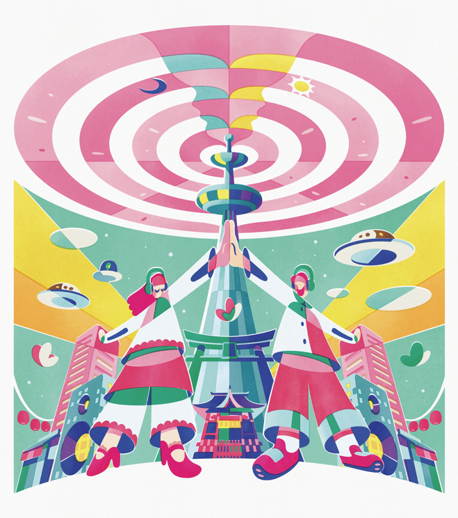 今回のビジュアルは、 台湾・台北を拠点に活動するイラストレーター 鄒 昀達(Tzou YunDa)氏による描き下ろし。人々が天神のまちで そしてLOVE FMの周波数のもとで集う様子を、近未来感あるタッチで描き、配色と版画のようなアレンジでレトロに仕上げています。