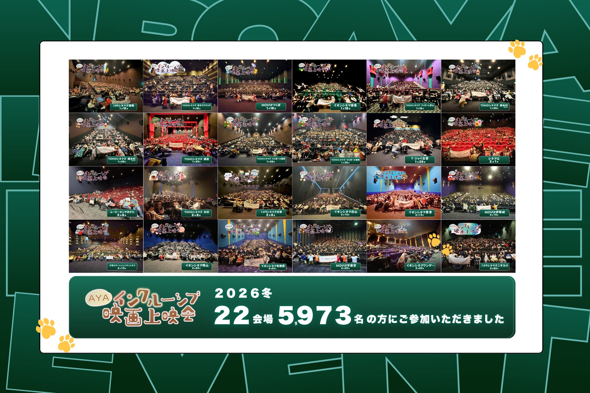 AYAインクルーシブ映画上映会は、2023年4月に初回開催が実施されました。2024年春からは1シーズンあたり、複数劇場での開催をするようになりました。2026年の冬、3県での初開催が叶ったことで、目標であった47都道府県の開催を達成することができました。多くの関係者・ボランティアの皆さま、ご参加くださった皆さまに、心より御礼申し上げます。