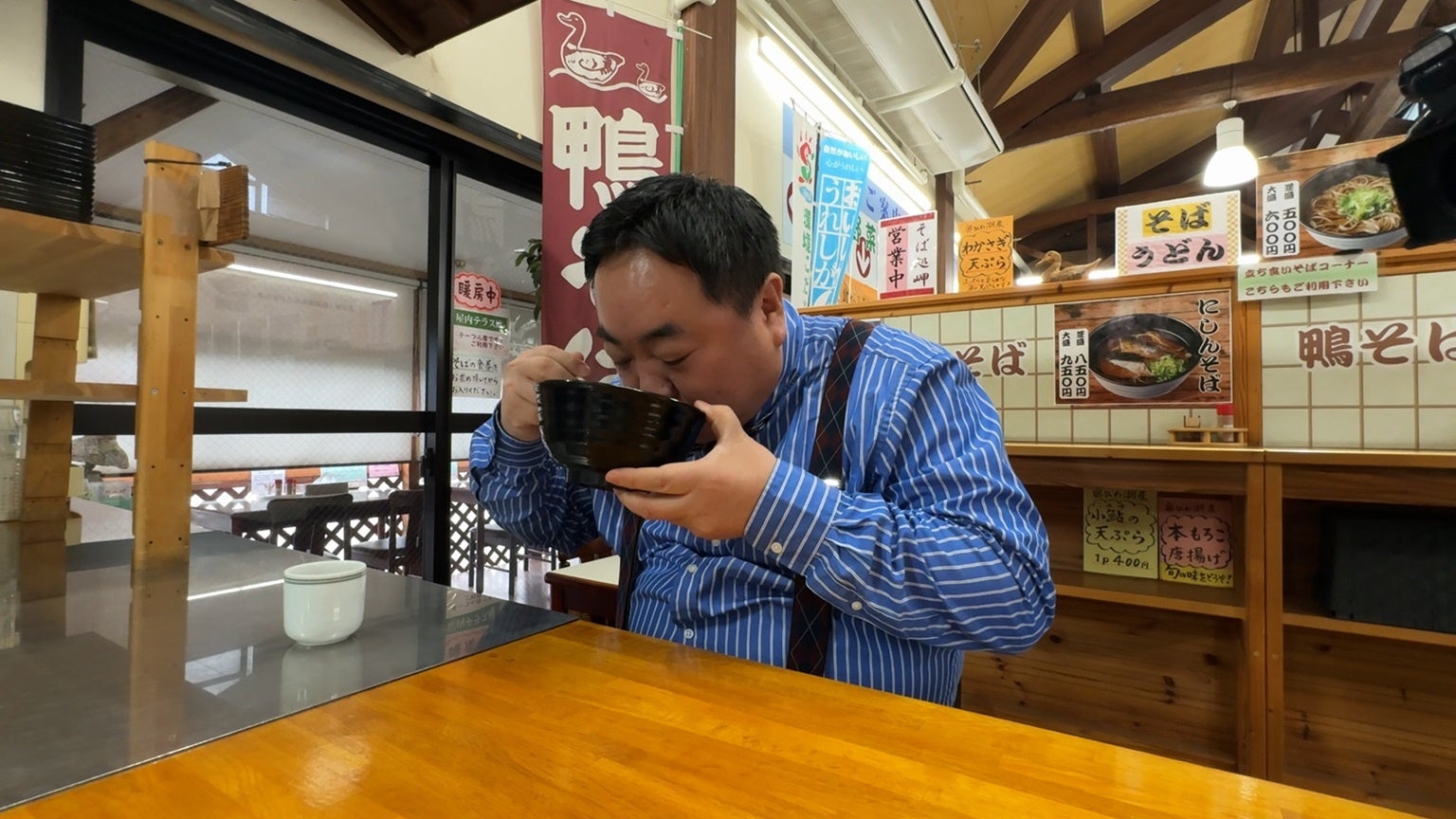 店内のいたるところに「鴨そば」の看板が掲げられ、券売機でも一際大きなボタンが鴨そば。その鴨そばは、先代の父から受け継いだ味。かつて琵琶湖では鴨猟が盛んで、地元の食文化を残したいという思いで提供を始めたという。昆布と鰹節に鯖・いりこを重ねた奥深い出汁に鴨の脂が溶け合う絶品の一杯を、幻のスジエビかき揚げとともに堪能する。雪のちらつく寒い中「鴨の脂の甘みがしみてきて絶品ですわ〜」と温かなそばで満たされる。