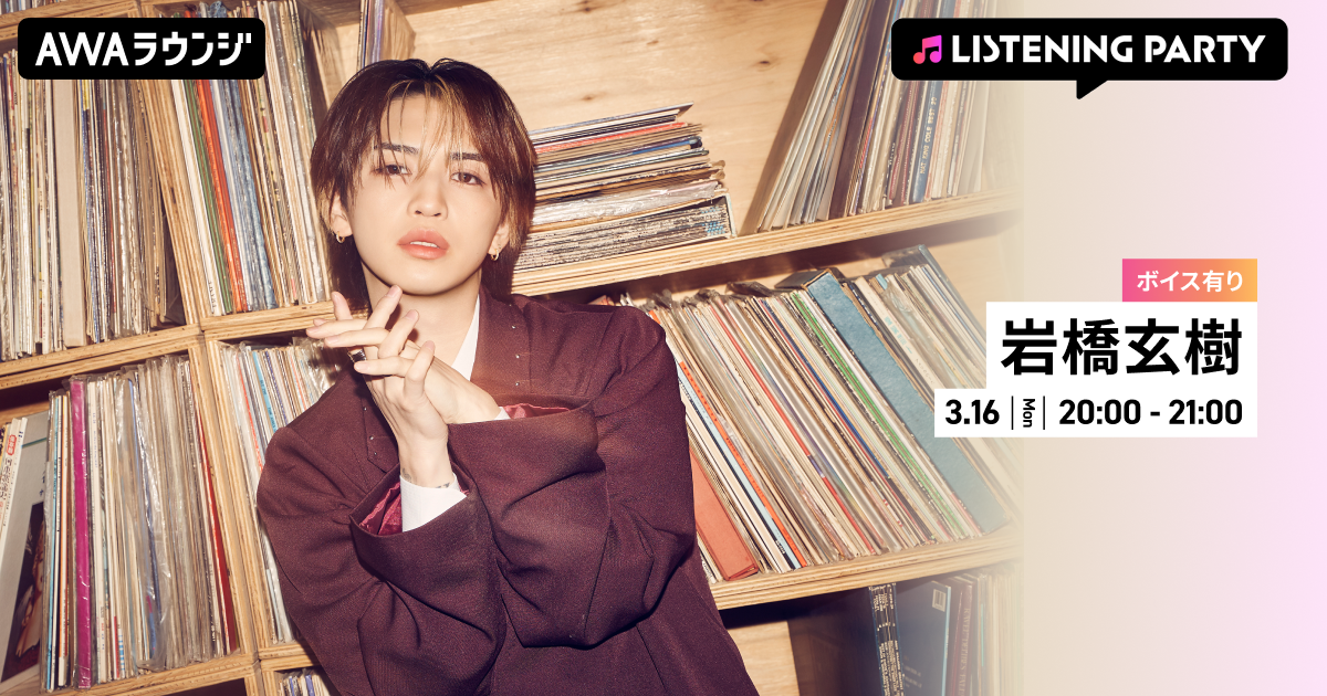 AWA株式会社(本社:東京都港区、代表取締役CEO:冨樫晃己)が運営する、サブスクリプション型(定額制)音楽ストリーミングサービス「AWA(アワ)」は、2026年3月16日(月) 20:00~21:00の1時間に渡り、無料で誰でも参加できるオンライン空間「ラウンジ」で、岩橋玄樹特集のリスニングパーティーを開催いたします。