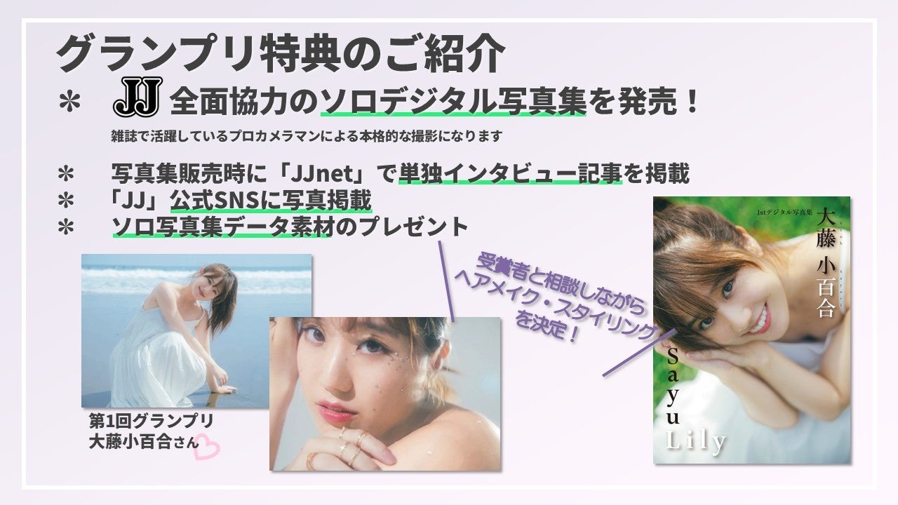 創刊50周年のファッションメディア「JJ」は、2024年以来となる「第2回ソロデジタル写真集オーディション」を開催いたします。見事グランプリに選ばれた1名は、「JJ」全面協力で制作されるソロデジタル写真集の出演権利が贈呈されます。