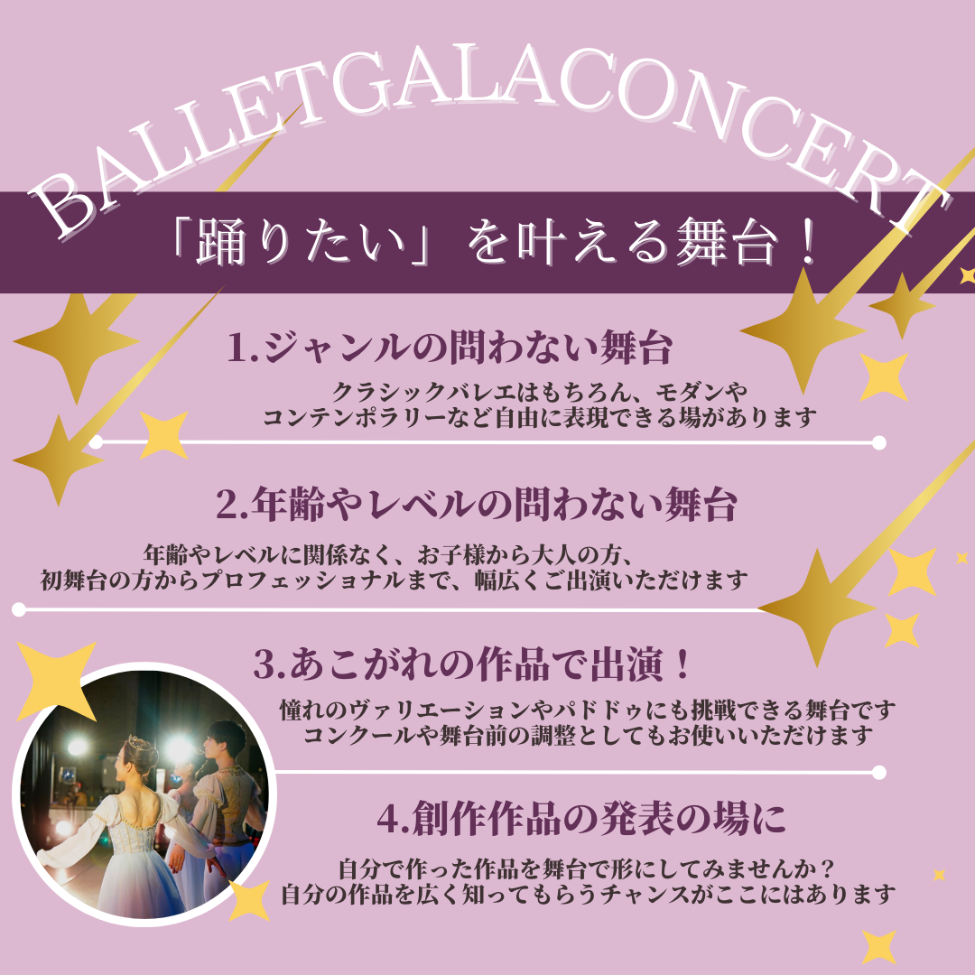 みんなの「踊りたい!」を叶えるバレエガラコンサート。毎年多くの出演者が集います。多くのバレ エ愛好家たちとこの場で出会い、バレエの魅力を存分に分かち合いませんか。