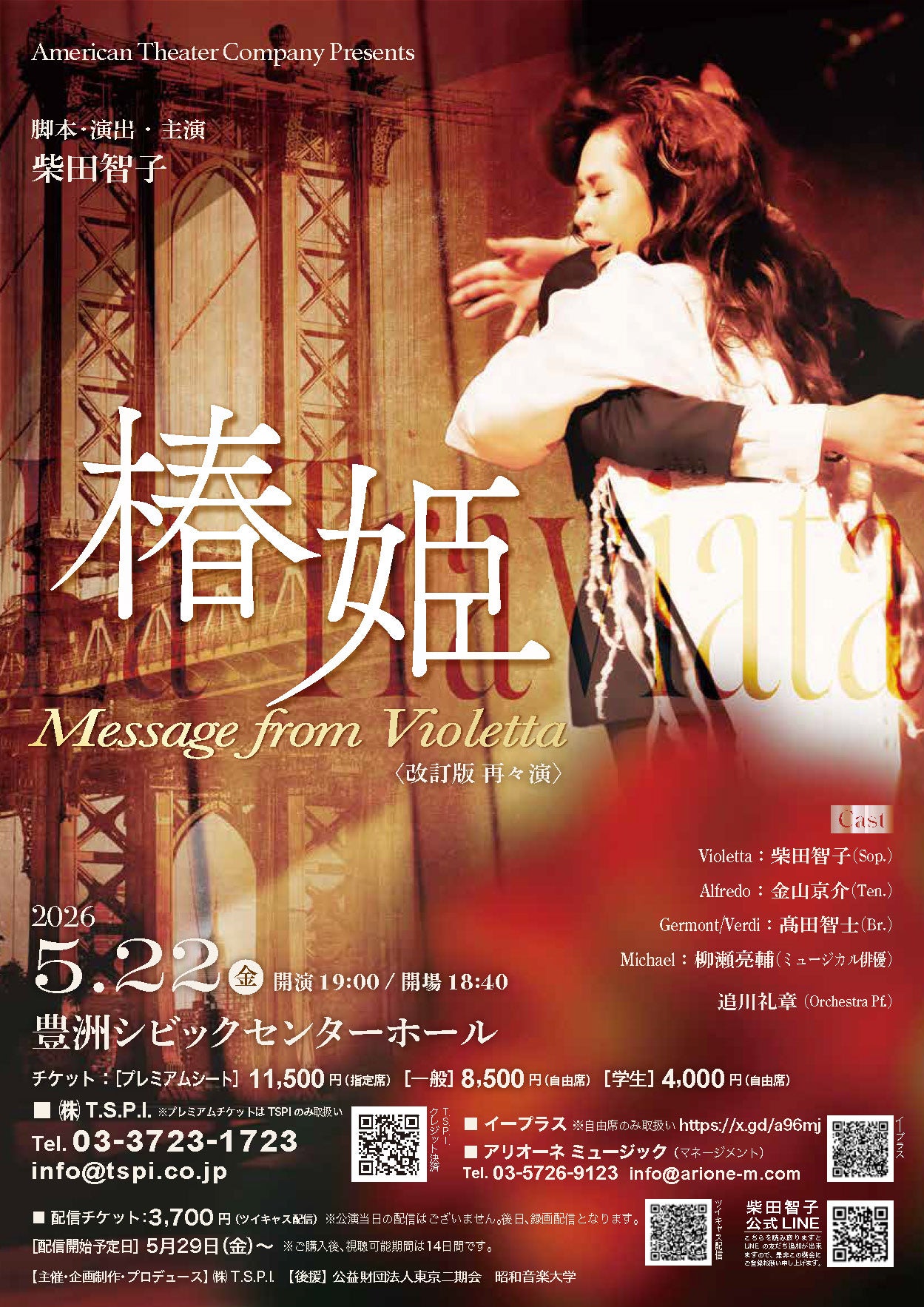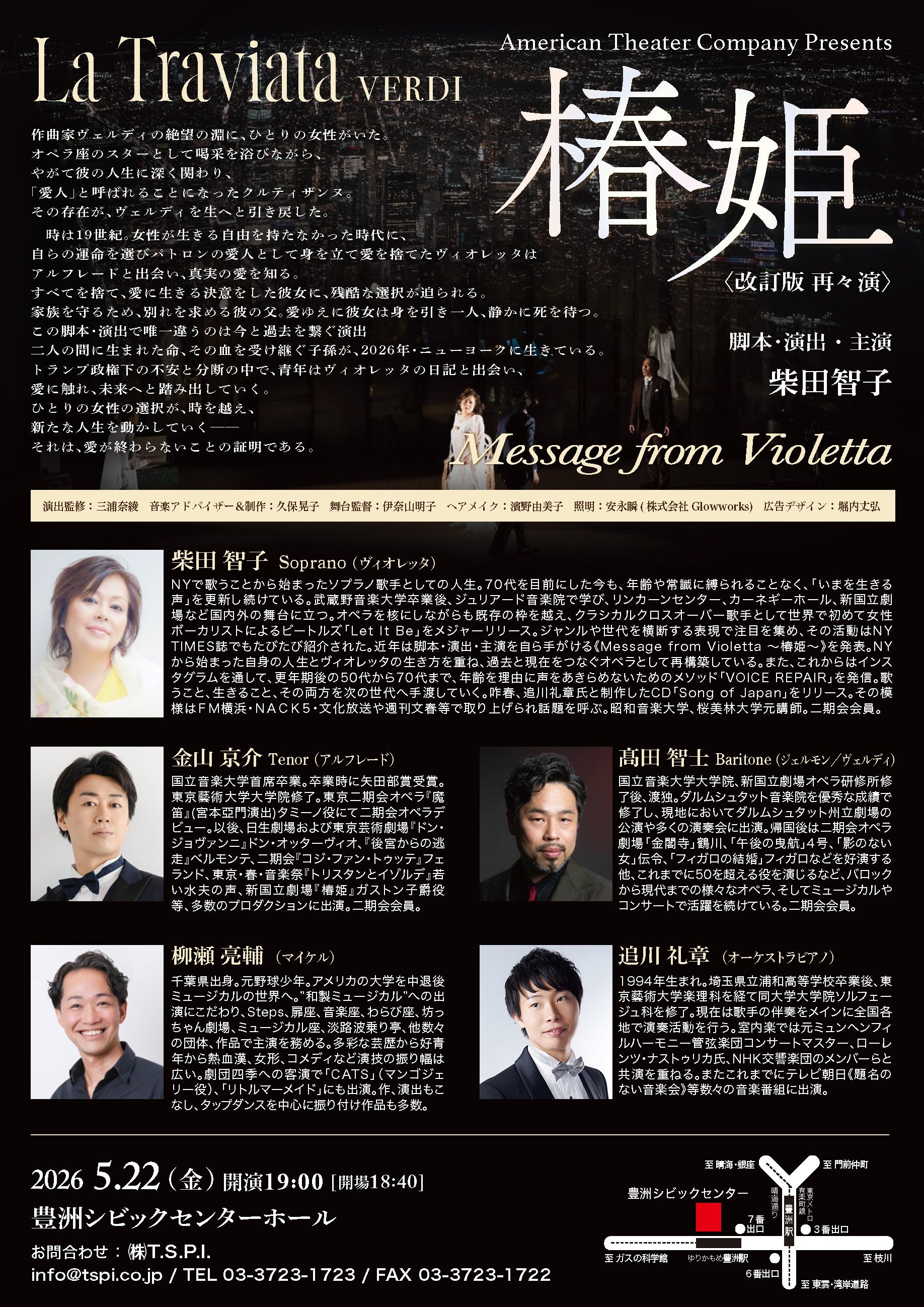 VERDI オペラ「椿姫」 Message from Violetta  柴田智子 脚本・演出・主演 再々演  2026年5月22日(金)19:00開演 豊洲シビックセンターホール