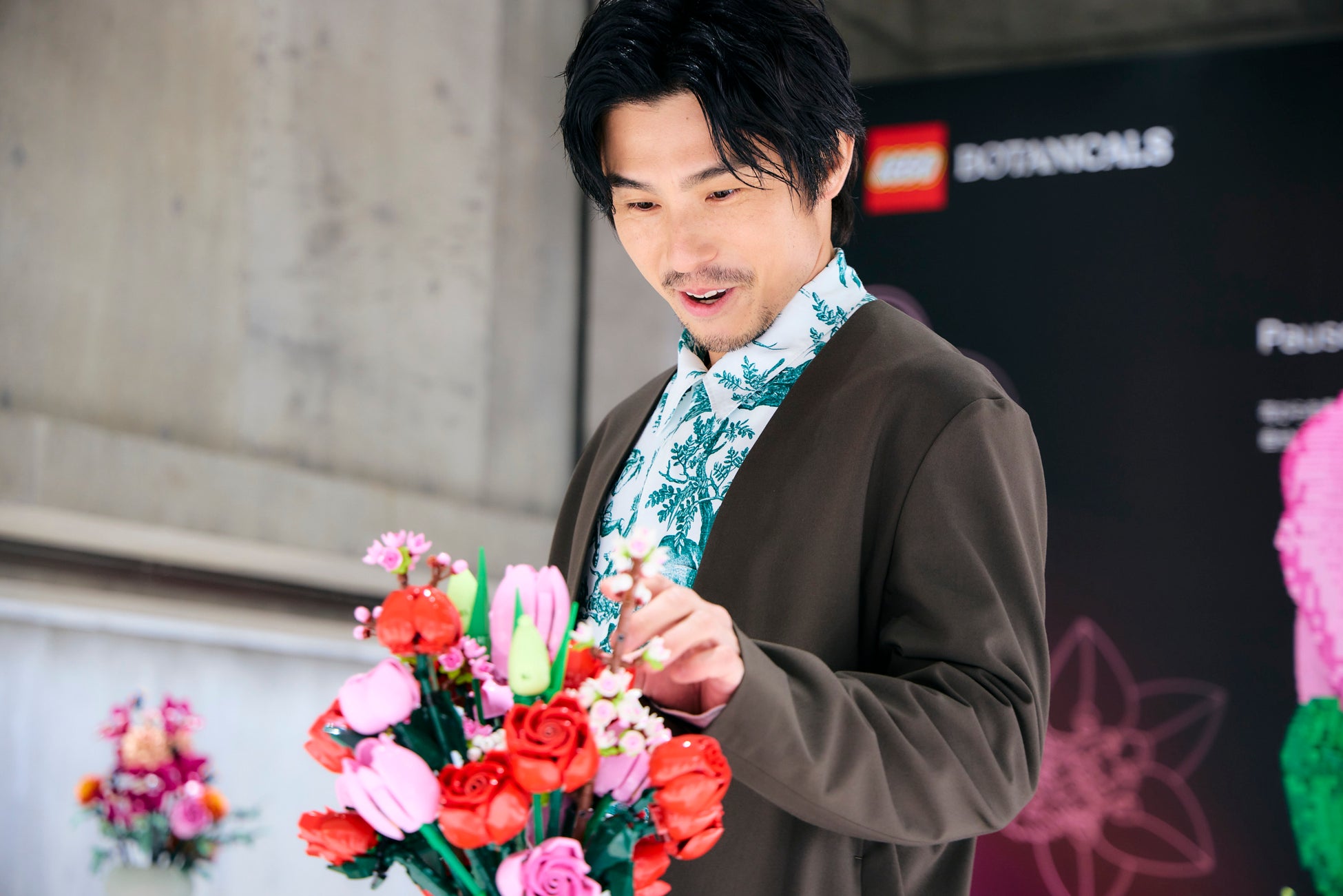 「レゴ®ボタニカル ブルームギャラリー」の会場中央には、レゴ®ブロックで組み立てられたピンクローズが展示され、その周りをさまざまなレゴ®ボタニカル製品からアレンジをして制作した6種類のオリジナルブーケが展示されています。ブーケにあしらわれている花の「花言葉」をもとに、各ブーケには「果てなき歓び」や「羽ばたく夢」といったタイトルとメッセージが添えられています。そして、会場内には、中尾明慶さんと倉科カナさんがプロデュースをしたレゴ®ボタニカル製品を組み合わせたアレンジメントブーケもお披露目されました。お二人の今の気持ちを映し出す“自分らしさ”を表現したオリジナルアレンジを通して、レゴ®ボタニカル製品の新たな魅力を発信します。また、会場では、レゴ®ボタニカル製品の簡易的な組み立て体験も可能で、来場したお客さまが組み立てた 1 輪の草花は会場内に飾り、春の花壇を完成させます。この体験を中尾明慶さんと倉科カナさんもひと足先に体験し、楽しんでいる様子が見られました。