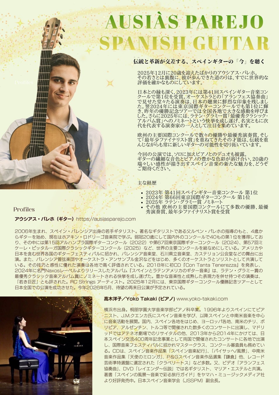 ギターの繊細な音色とピアノの豊かな色彩が溶け合い、20歳の瑞々しい感性が描き出すスペイン音楽の新たな魅力を、どうぞご期待ください。
