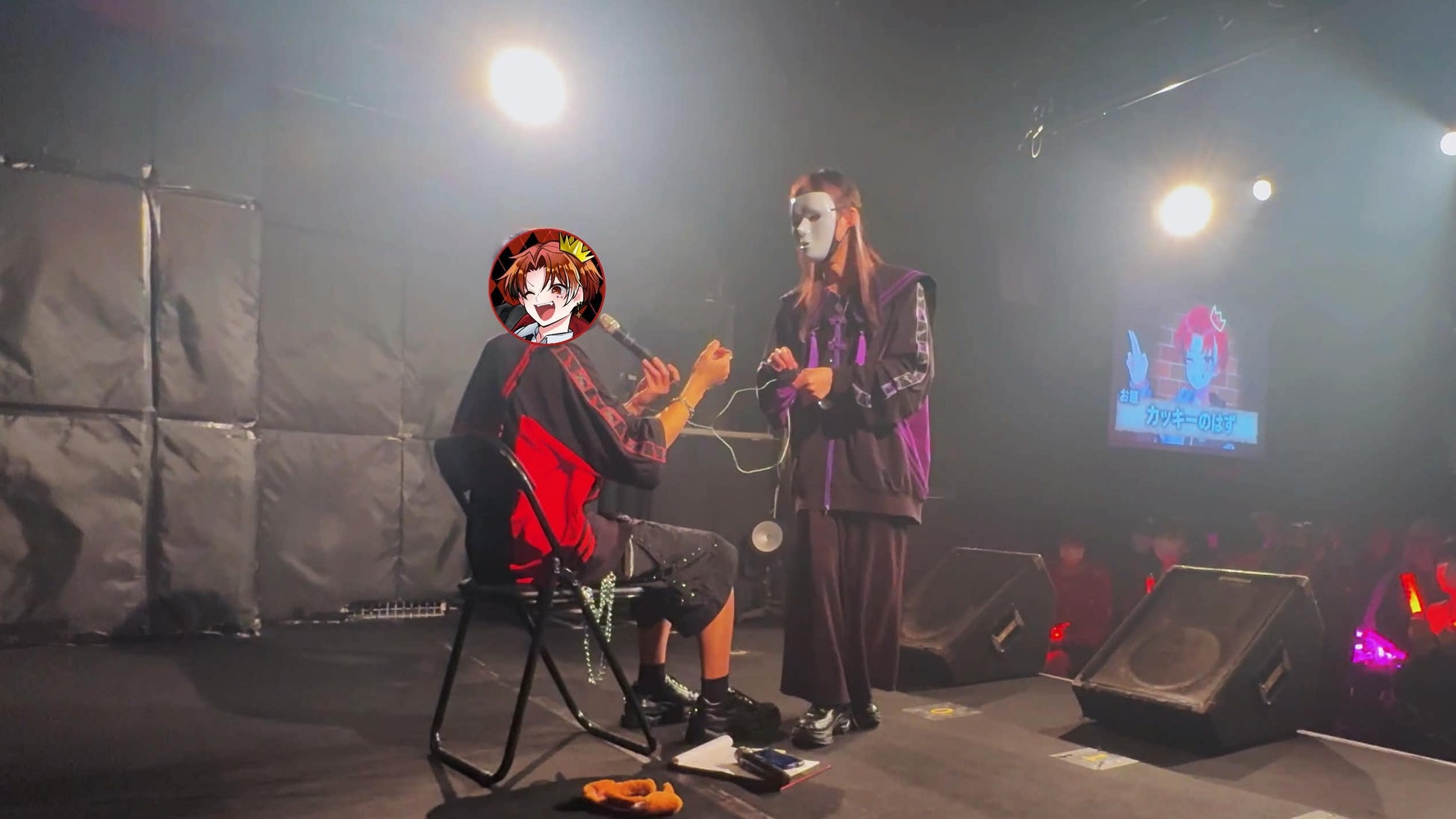 1曲目終了後MC中「お腹が痛いからトイレに行く」とどもとみが舞台袖に離脱。カッキーがひとりで場を繋ぐ展開となりました。その後どもとみの扮する仮面の男が登場し、誘拐された下西社長を返してもらうため、「死のアキネーター」が実施されました。