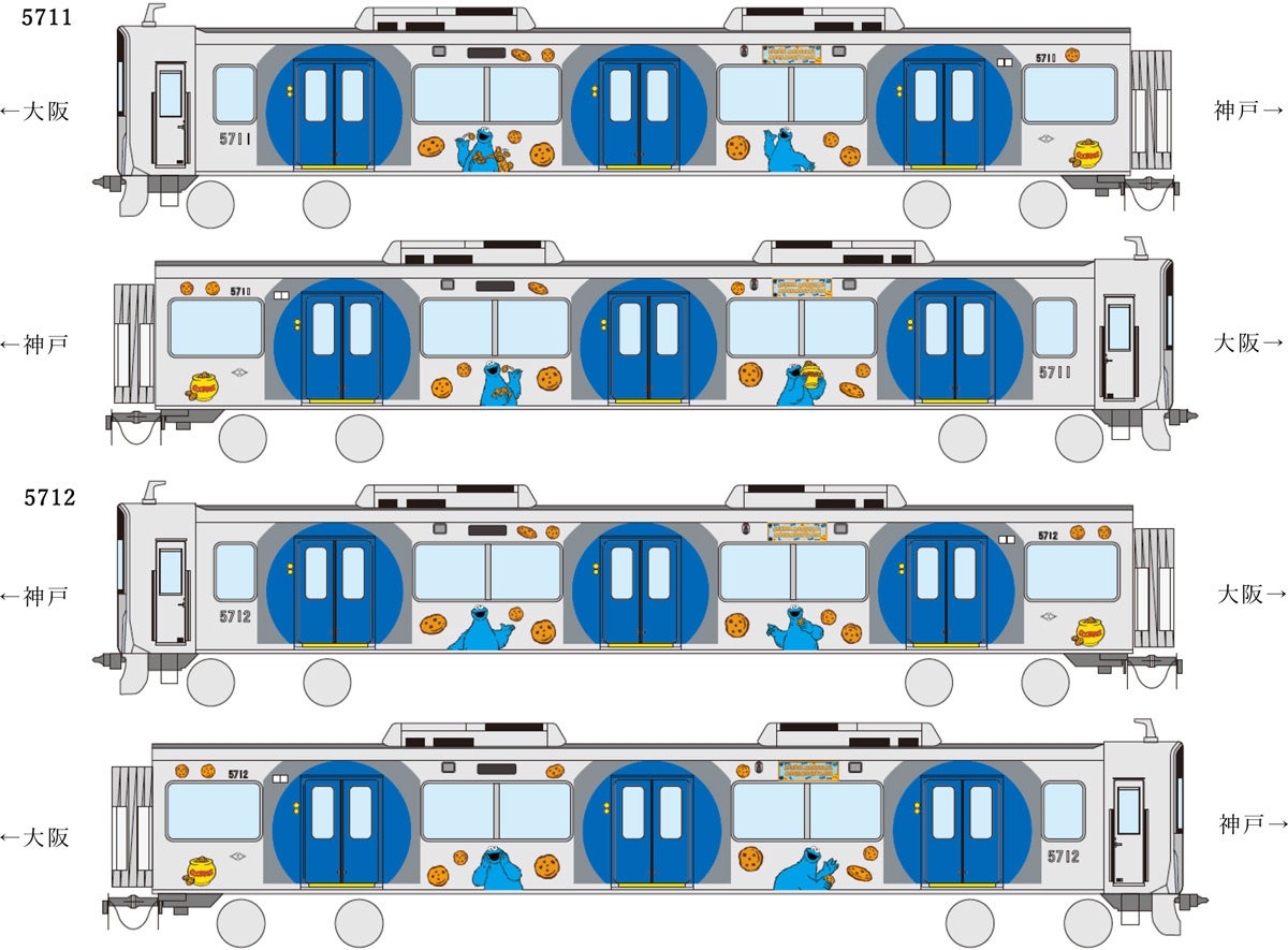 今回は、その最初の企画として、エルモ、クッキーモンスターがそれぞれデザインされたラッピングトレイン2編成を3月26日(木)から順次運行するほか、阪神グループの施設を巡るスタンプラリー「阪神沿線に隠れたセサミストリートの仲間を探し出せ!」も3月26日(木)から開催します。また、4月4日(土)にはエルモとクッキーモンスター、さらに2編成のラッピングトレインが大阪梅田駅に登場し、皆さまをお出迎えします。
