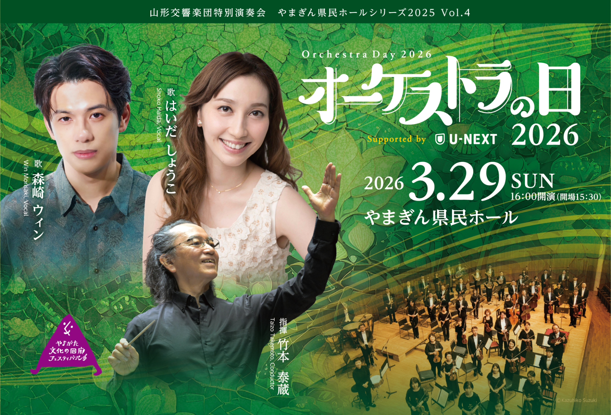 また、U-NEXTと山形交響楽団が、3月29日(日)に山形・やまぎん県民ホールにて開催するファミリーコンサート『オーケストラの日2026 Supported by U-NEXT ”PLAY, NEW TOHOKU.”~with森崎ウィン&はいだしょうこ〜』のチケットはただいま好評発売中です。当日は、特別ゲストアーティストとして、森崎ウィン、はいだしょうこが登壇するほか、人気キャラクター・たべっ子どうぶつのどうぶつたちも登場予定です。家族で楽しめる楽曲たちを、ぜひ山形交響楽団のオーケストラとともにお楽しみください。