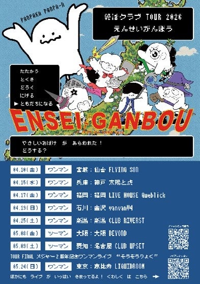 また、2025年12月に初の東名阪クアトロツアーを完走した終活クラブは、次なる目標として5月24日(日)にメジャー2周年記念単独公演「そうぞうりょく」と題した初の恵比寿LIQUIDROOMワンマンの開催を決定!この公演をファイナルとして、4月からは「えんせいがんぼう」と題した全7公演の全国ツアーも開催。
