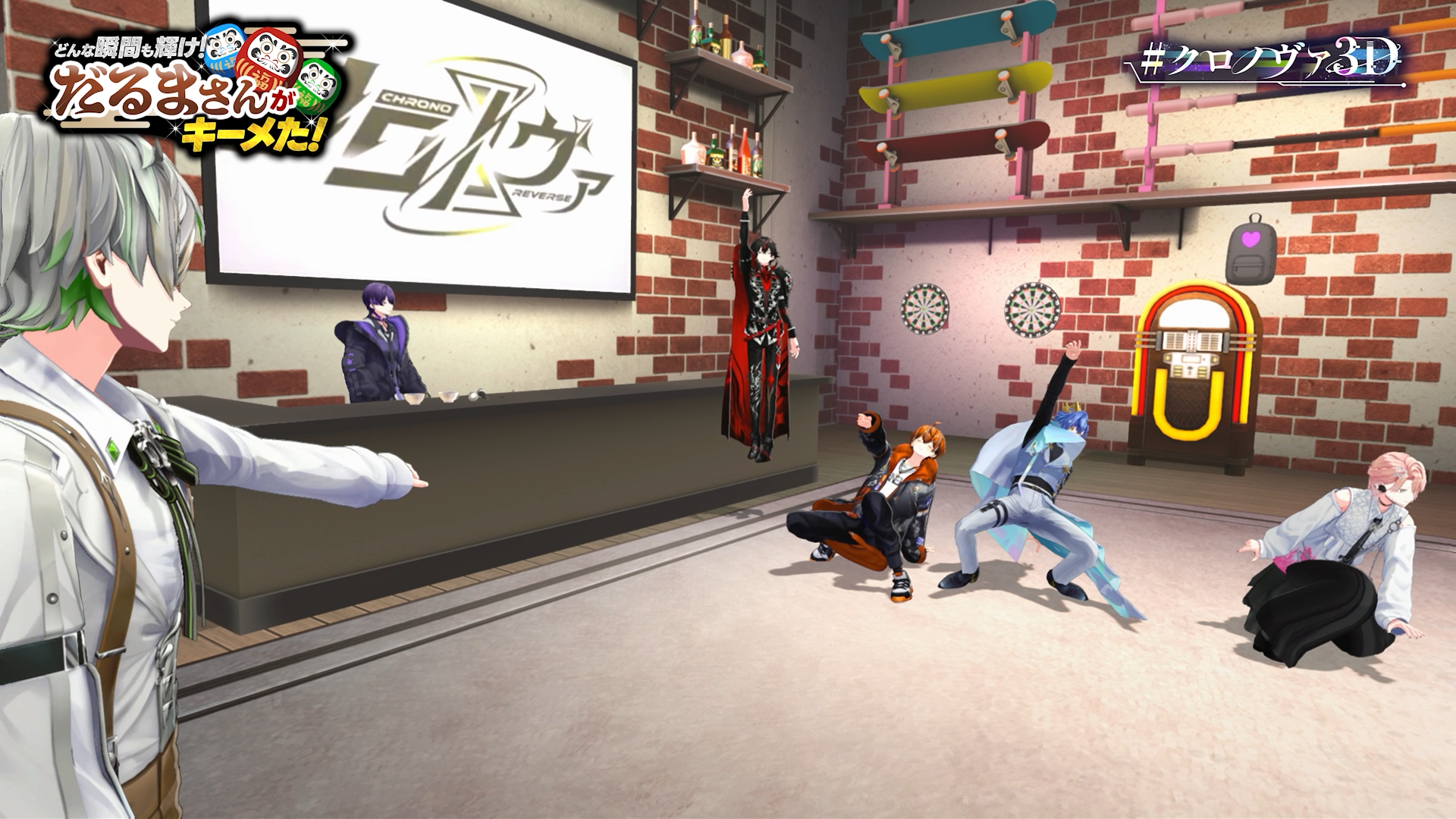 周年配信では、クロノヴァの活動拠点である“アジト”も3D空間として再現されました。ステージ上のライブだけでなく、グループの拠点そのものを舞台として展開することで、従来の「ライブ会場」型の配信とは異なる没入感のある演出が実現しました。“3Dだからこそ届けられるクロノヴァらしさ”をテーマに、ステージパフォーマンスだけに留まらないバラエティ企画も展開。メンバー同士の掛け合いや自然な動きが見られることで、ファンにとってはより近い距離でクロノヴァの魅力を感じられる内容となりました。配信のラストでは6人全員がそろい、楽曲「イケナイ太陽(Cover)」を歌唱。エネルギッシュなパフォーマンスでフィナーレを飾り、画面越しでも一体感を感じられる熱量の高い締めくくりとなりました。