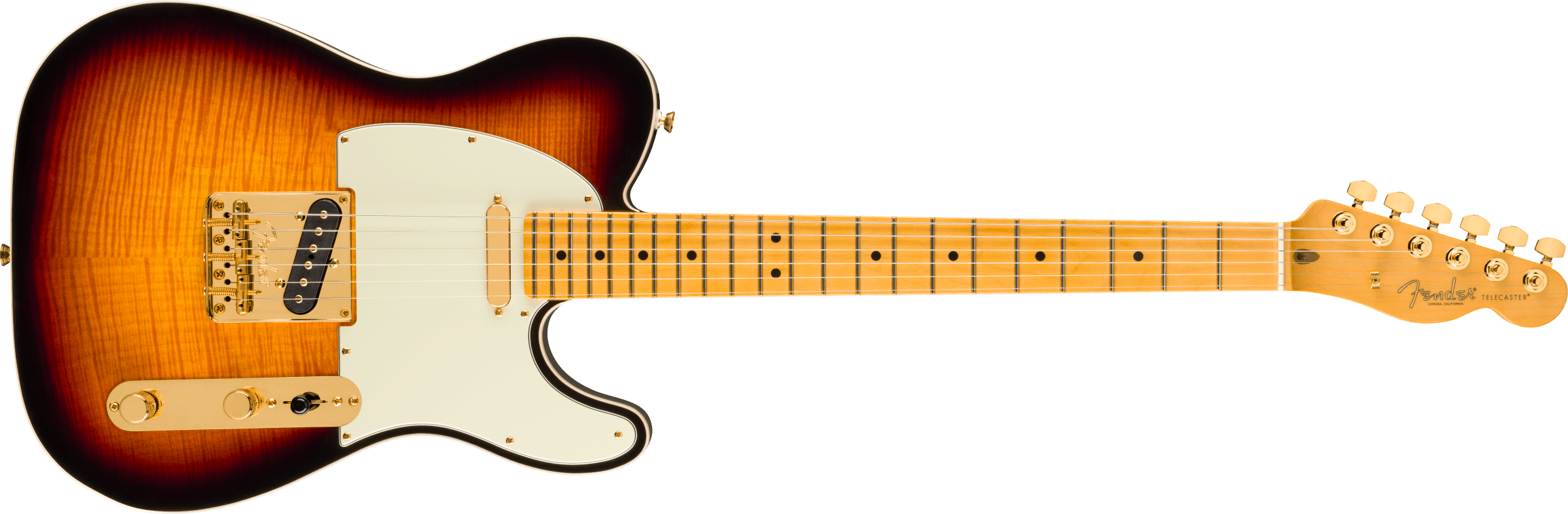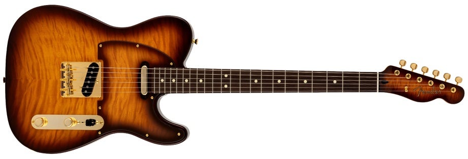 フレイムメイプルトップとダブルバインディングを採用したラグジュアリーなカスタムテレキャスター。75th Anniversary V-Modピックアップ、ネックとブリッジピックアップのシリーズ配線を可能にするプッシュ/プッシュポットを搭載し、エレガントなゴールドハードウェアで仕上げています。