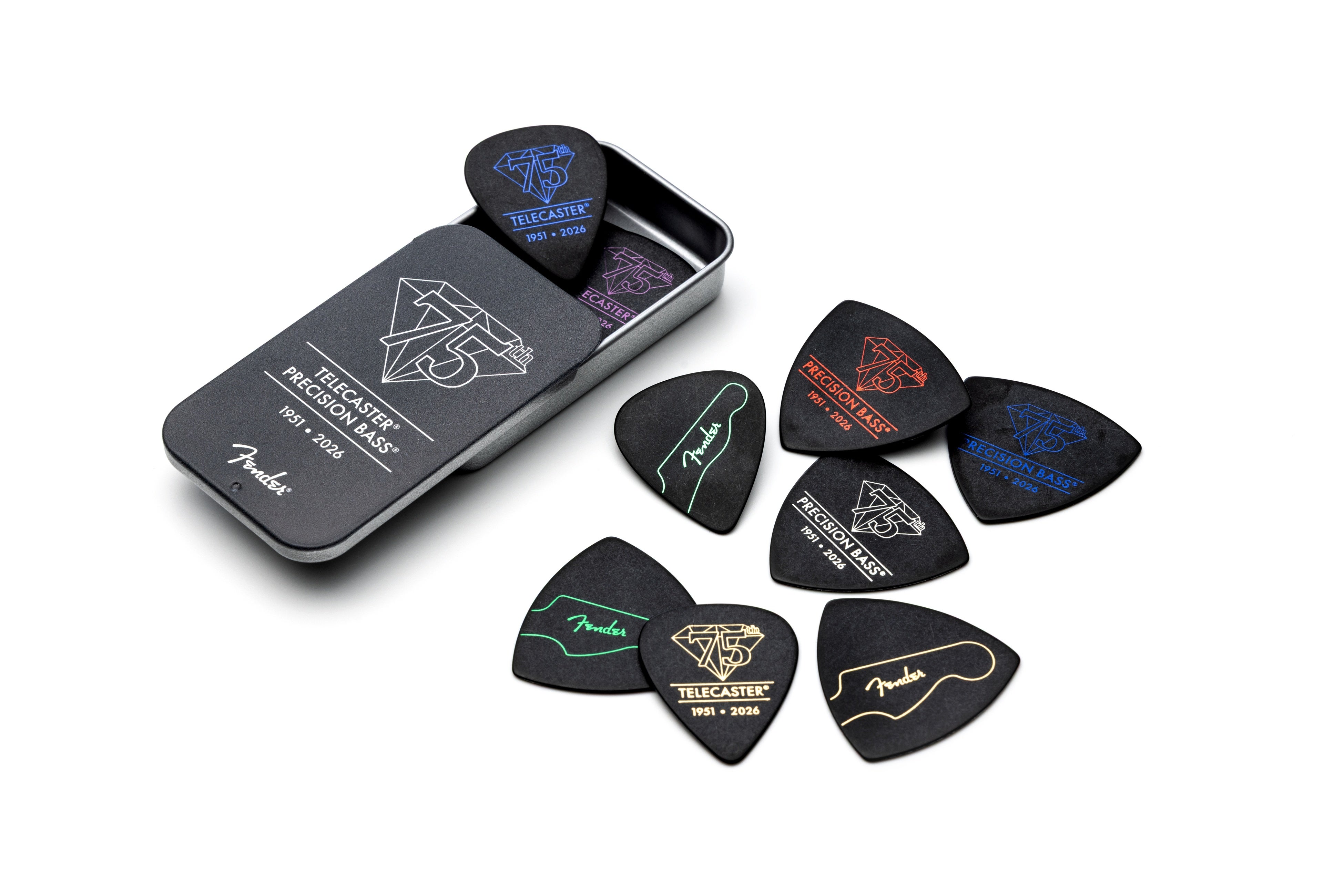 ピックには、優れた耐久性と安定した弾き心地で人気のポリアセタール素材(1.0mm)を採用。形状は定番の351と346の2種類をラインナップしました。それぞれの形状に、6種類のメタリックカラーで表現された75周年記念ロゴをあしらい、アニバーサリーイヤーにふさわしい華やかな仕上がりとなっています。さらに、同じく75周年の記念ロゴをデザインしたスライド缶ケースが付属。約7cm × 4cmのコンパクトなサイズで、ピックの収納はもちろん、日常で持ち歩く小物を入れるケースとしても活躍します。※Fender Flagship TokyoおよびFender公式オンラインショップ限定販売。発売:2026年4月予定