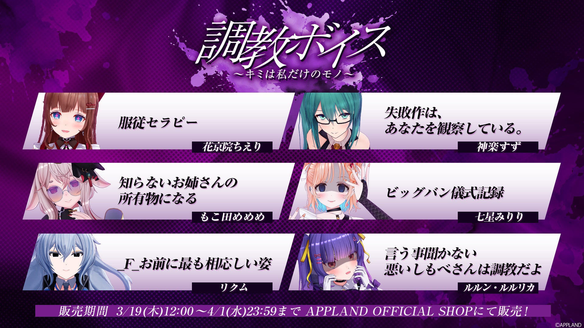 .LIVEとぶいぱいメンバーそれぞれが考案した、”調教”に関するシチュエーションが楽しめるボイスコンテンツをAPPLAND OFFICIAL SHOP(https://4693.live/)にて2026年3月19日(木)12時から販売いたします。