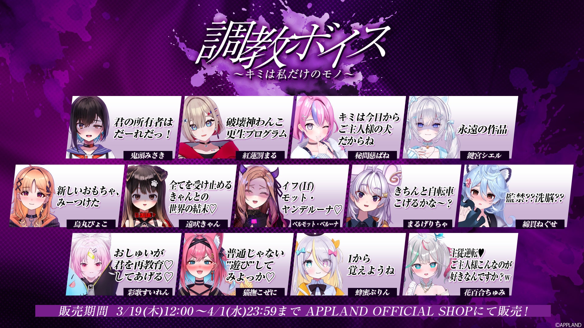 .LIVEとぶいぱいメンバーそれぞれが考案した、”調教”に関するシチュエーションが楽しめるボイスコンテンツをAPPLAND OFFICIAL SHOP(https://4693.live/)にて2026年3月19日(木)12時から販売いたします。