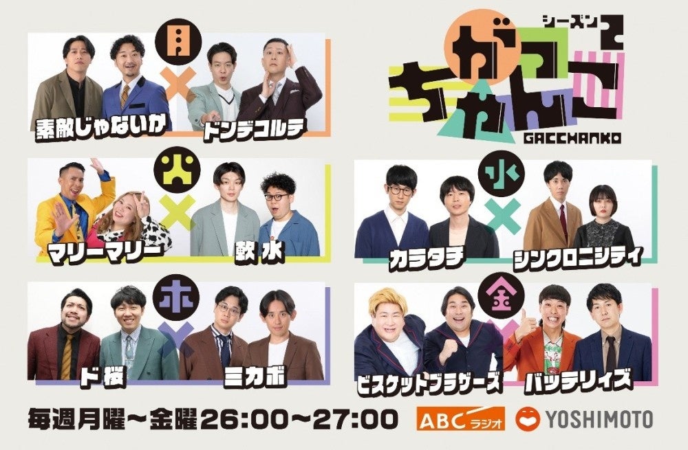 毎日2組の芸人が個性と個性を『がっちゃんこ』させて送る日本一わちゃわちゃした深夜ラジオ番組が、スタートから1年を経てリニューアルします!