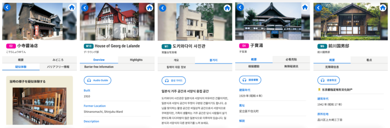 「江戸東京たてもの園鑑賞ナビ」は、園内に移築保存された30棟の復元建造物と、29点の屋外展示物の解説を音声とテキストによりご覧いただける無料コンテンツです。より幅広いお客様に楽しんでいただけるよう多言語化を進め、日本語と英語に加えて、今春から韓国語と中国語(繫体字・簡体字)が新たに加わり、計5言語でご覧いただけるようになりました。ぜひ、「江戸東京たてもの園鑑賞ナビ」とともに、園内の散策をお楽しみください。