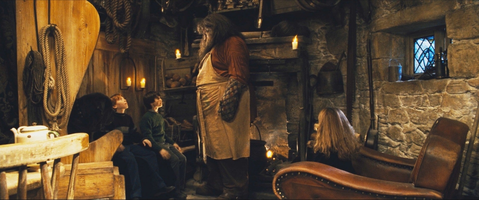 主要な登場人物のひとり、ハグリッド。半巨人であるハグリッドを演じたロビー・コルトレーンは身長約183cmと、半巨人を表現するには十分ではありませんでした。実は、身長208㎝の元ラグビー選手が、アニマトロニクス制の特製マスクを被ることで、大きなサイズのハグリッドを表現したのです。さらに、小道具にもハグリッドを大きく見せる秘密が。ハグリッド役のコルトレーンのカットを撮影するシーンは通常サイズの小道具、子役のカットを撮影するシーンは大きいサイズの小道具が使われました。