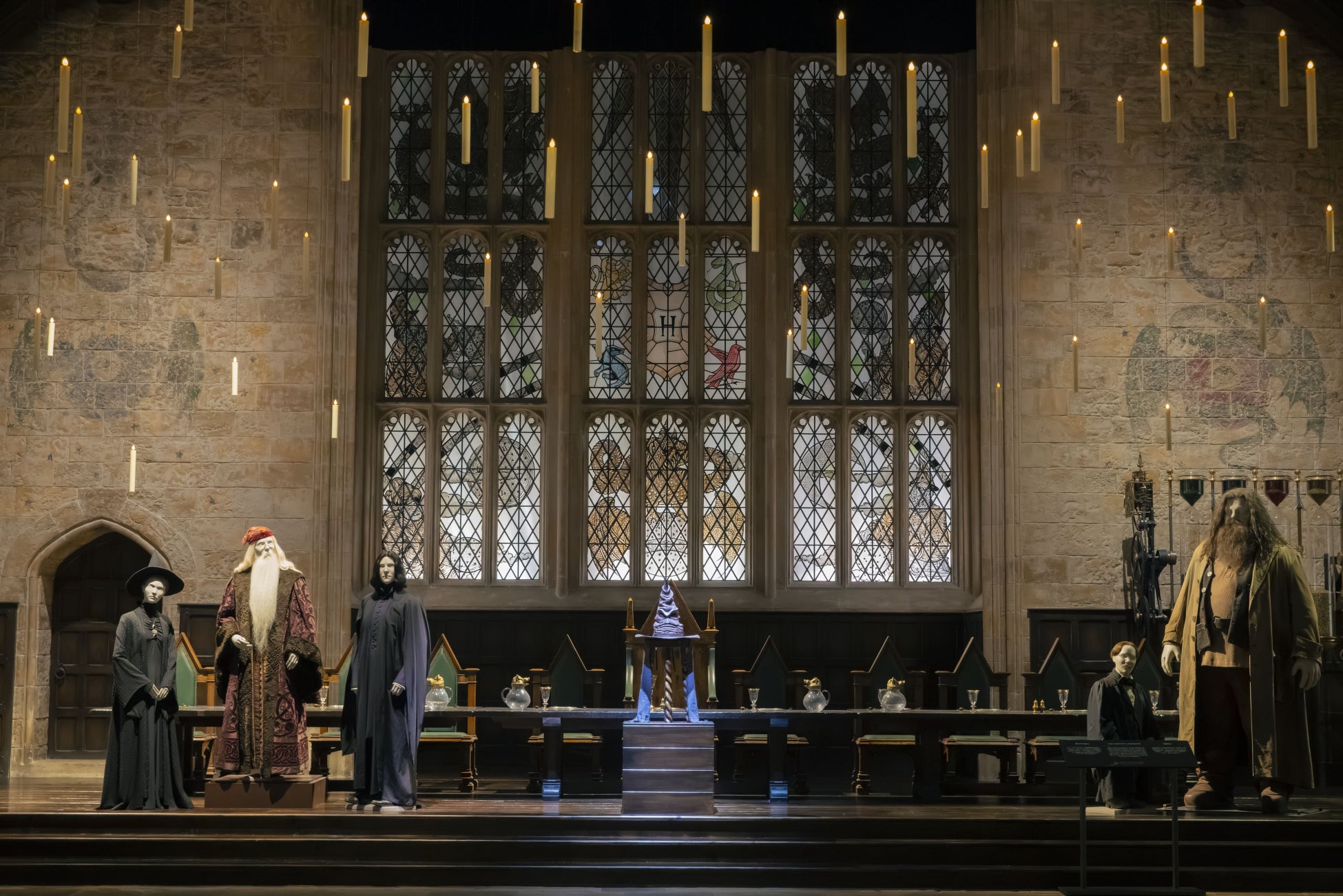 毎企画ごとにテーマに沿ったさまざまな装飾で来場者を迎えてきた大広間は、本企画で<組分けの儀式>の舞台へと様変わり。ホグワーツの新入生さながらに大広間へ足を踏み入れた皆さまを、宙に浮いた無数のキャンドルと組分け帽子がお出迎えします。