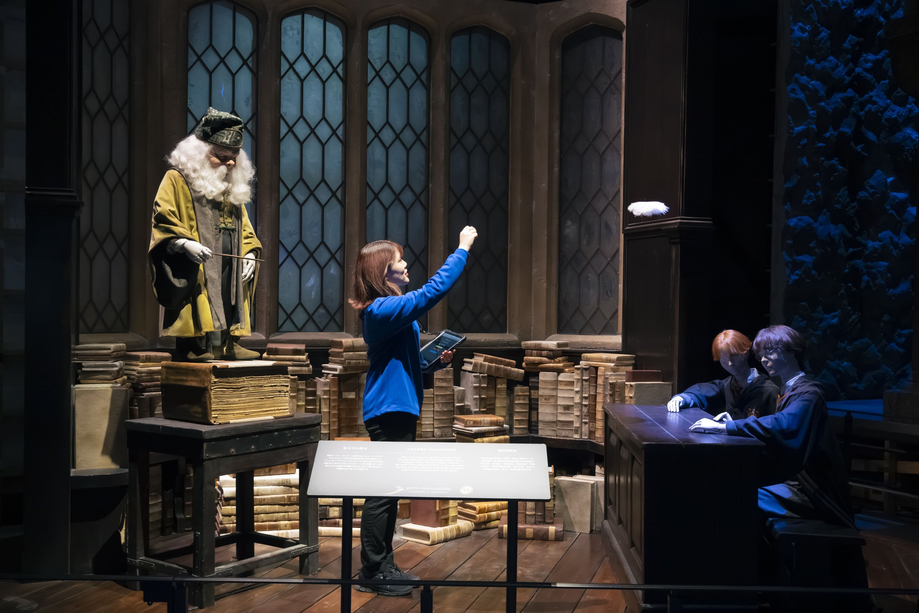 呪文学の授業で、ハーマイオニーが唱えた魔法の呪文「ウィンガーディアム・レヴィオーサ」によって羽が宙に浮かぶ印象的なシーン。羽を浮かす魔法は、特殊効果チームによる仕掛けを使って撮影されました。その手法は驚くほど単純で、サイレント映画の時代から使われる伝統的な手法。浮遊術の秘密を、インタラクターが目の前でデモンストレーションをしながら詳しく解説します。
